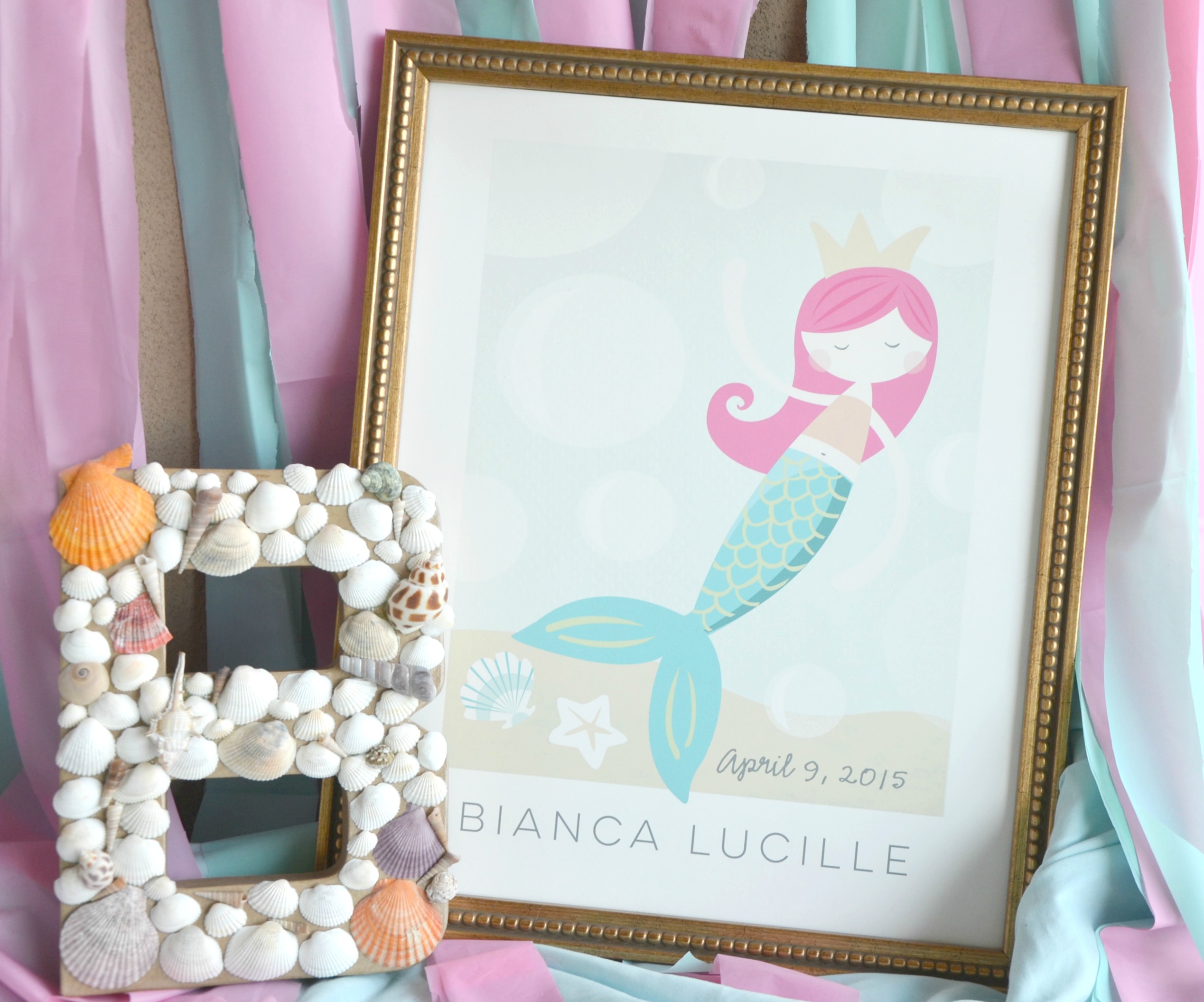 The party table also featured the Siren’s Song Custom Art Print and a DIY shell letter. I used gel glue and seashells to easily embellish the plain letter purchased from the craft store.