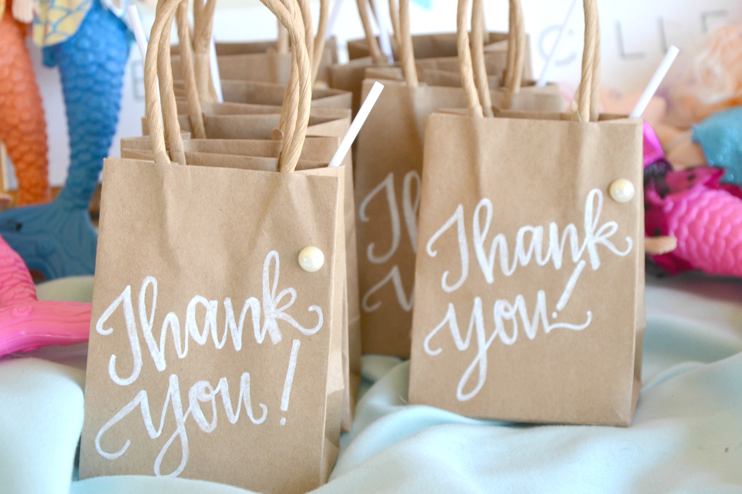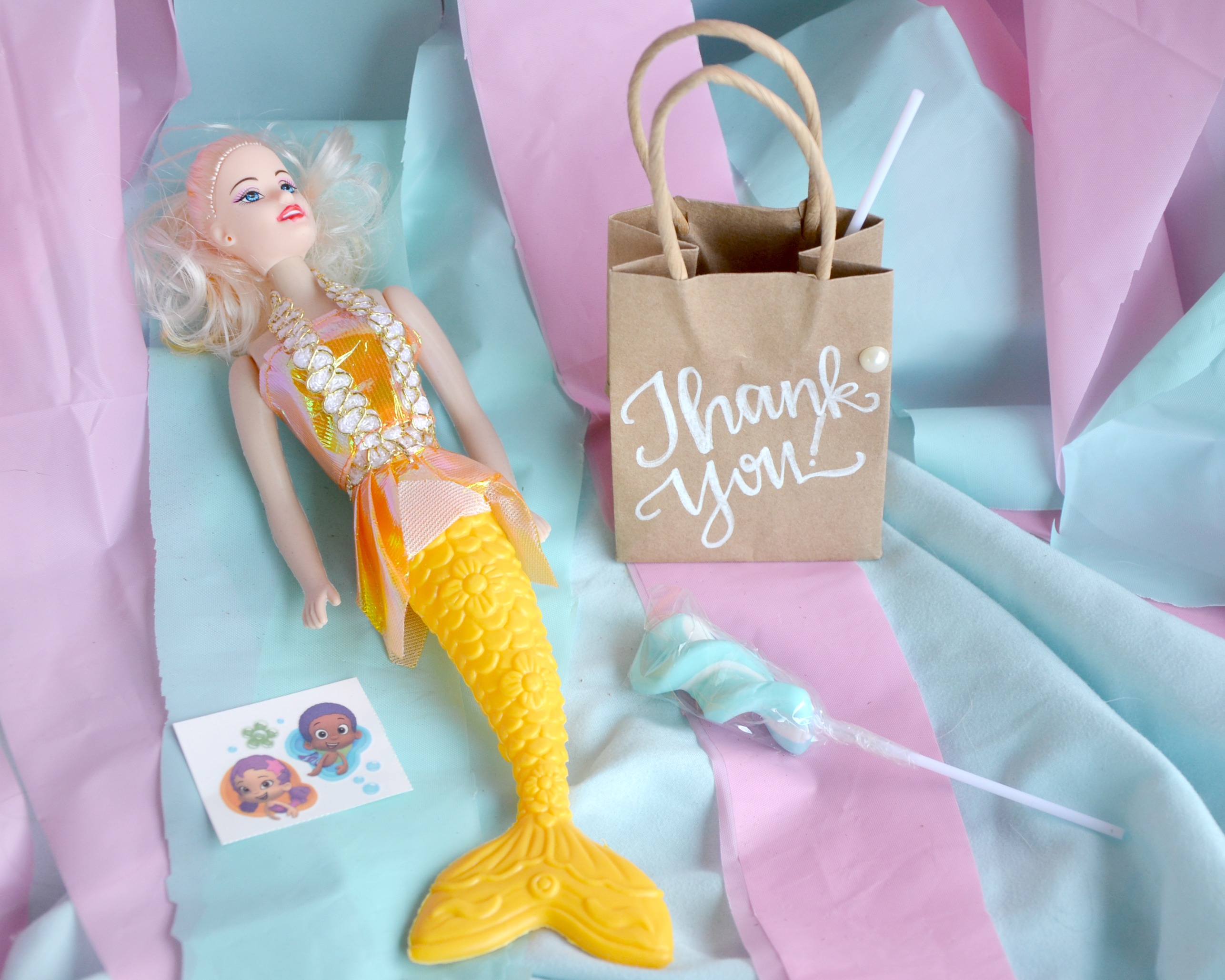 We filled the little thank you bags with suckers and mermaid tattoos. Because most of the guests were my seven year old daughter‘s friends, we gave them mermaid dolls as thank you gifts too. We found the dolls at the Dollar Store and they were perfect for the birthday mermaid party!