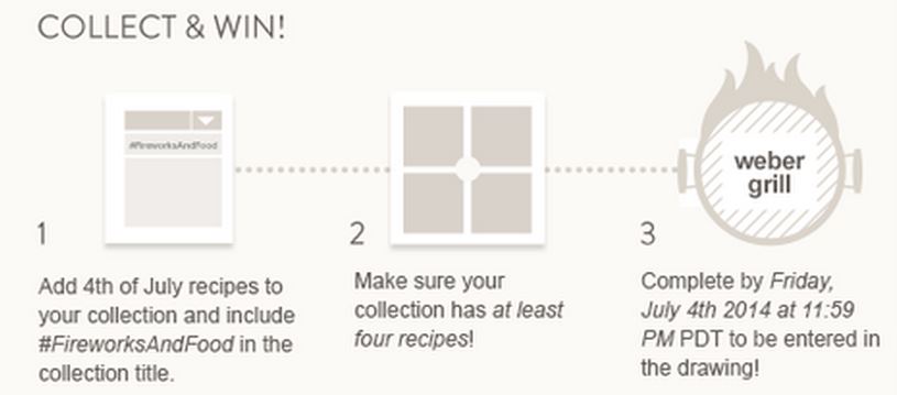 What could be better on the Fourth of July than grilling with a brand new $500 Weber Spirit E-310 Gas Grill ? You can enter to win by simply creating a collection of your favorite Fourth of July recipes. Use #FireworksAndFood in your collection title and share your favorite holiday recipes. Your Foodie recipe collection must be completed by July 4th at 11:59 PM PDT. See the official Fireworks and Food contest page for more information.