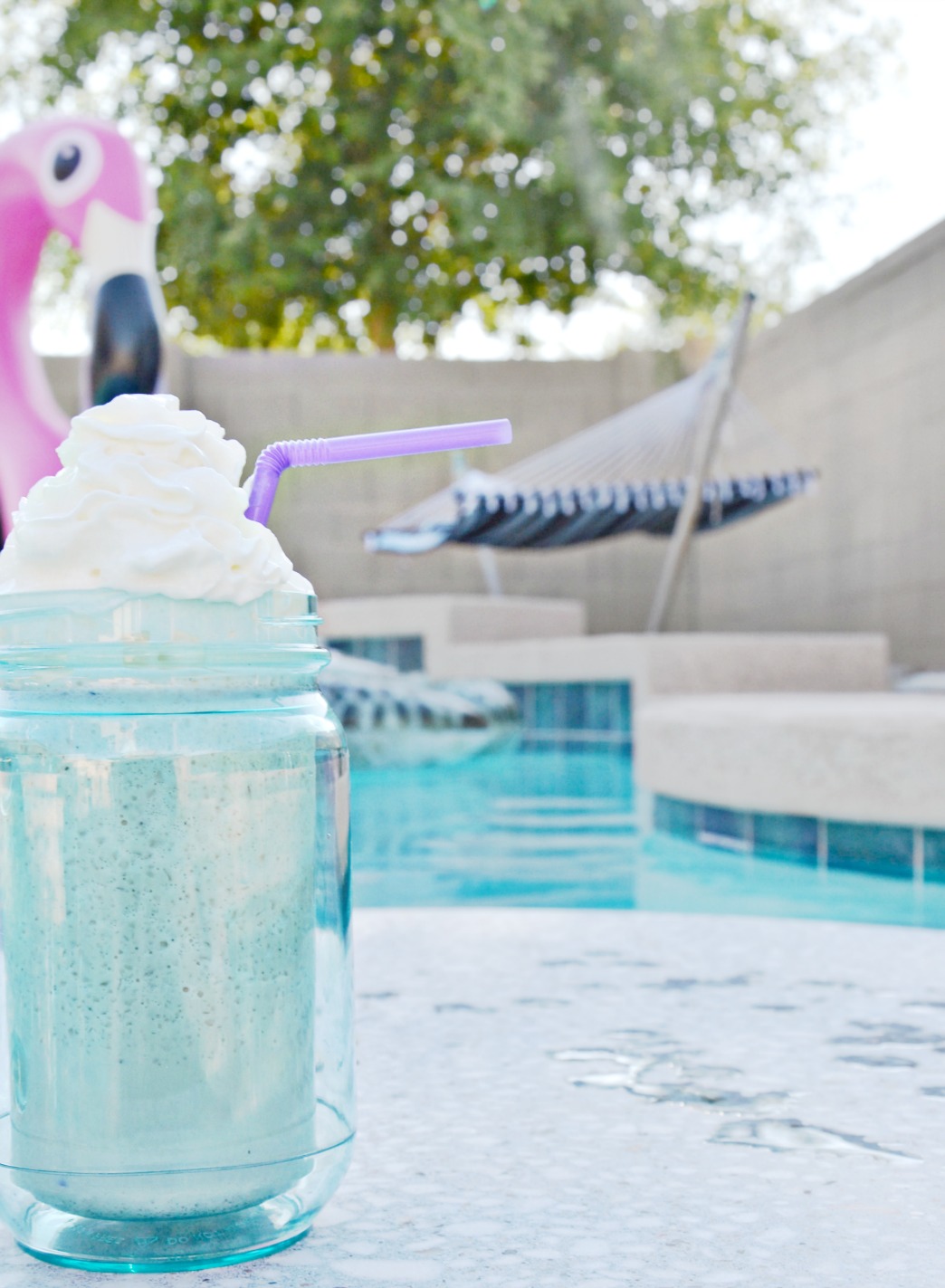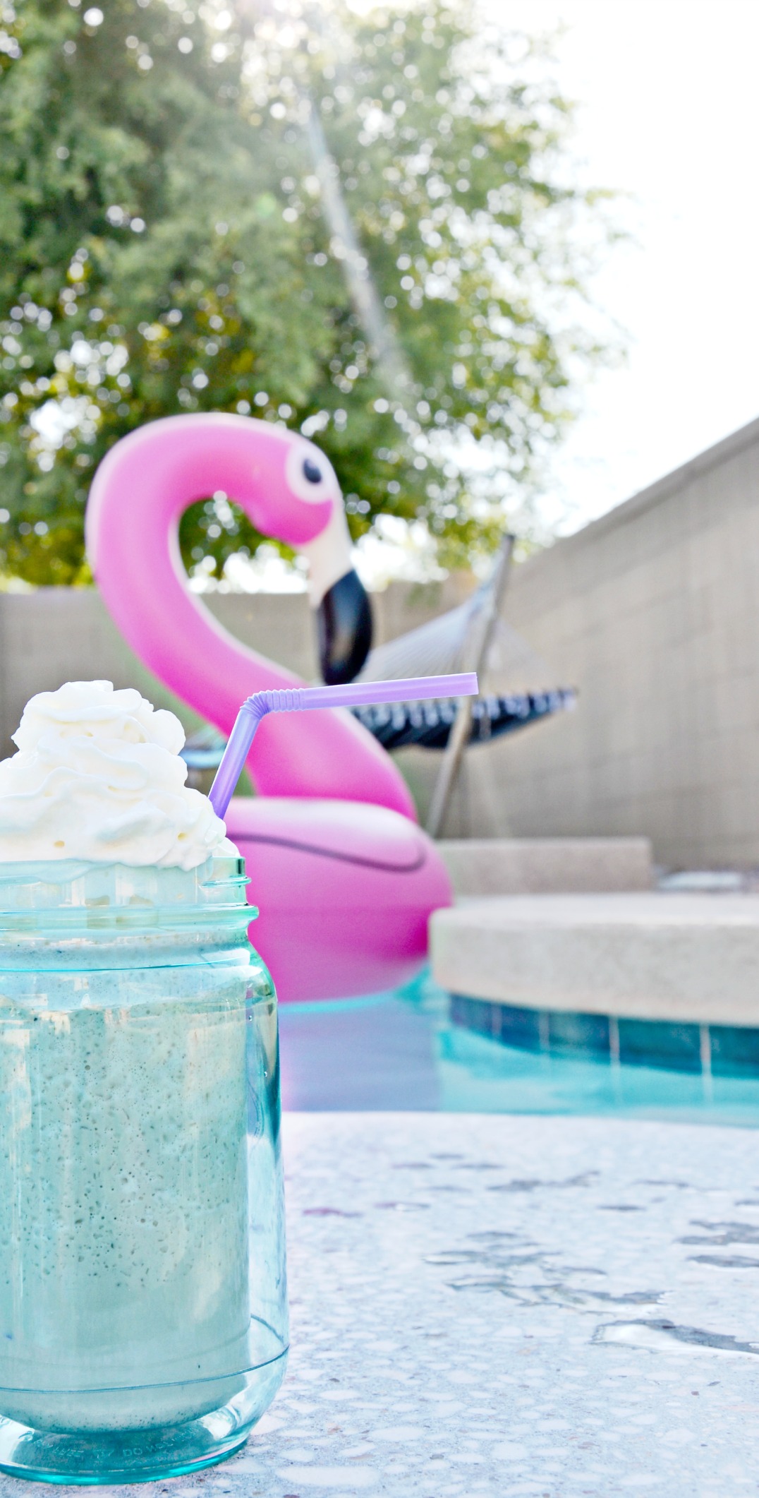 Blend until smooth. Pour into plastic insulated cup. It’s blazing hot outside and you want that creamy cold drink to stay frozen for as long as possible and you’re by the pool with kids playing so avoid using a glass. Top with as much Reddi-wip as you prefer. Add a straw and sip your way through that summer heat wave. Be sure to offer the kids ice cream cones so they don’t ask what’s in mommy’s cup. This one’s caffeinated and not for sharing. Mr. Pink Flamingo water tube might be eyeing your summer frappe in the pool too.