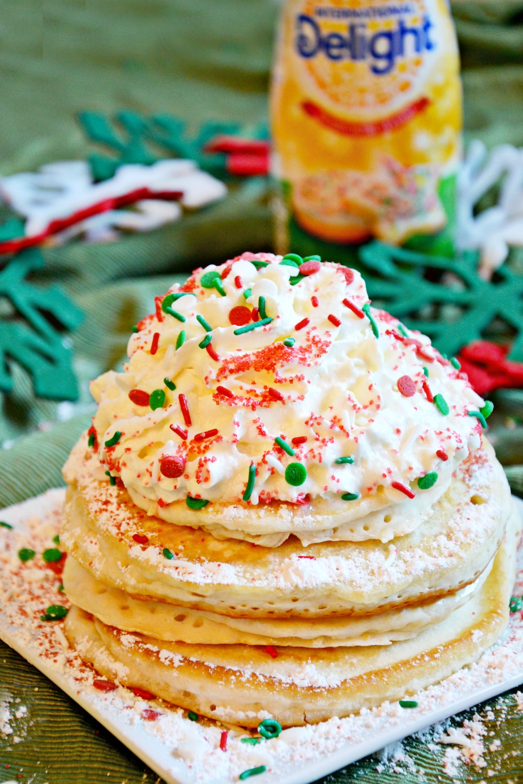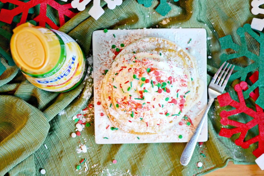 Let’s talk about these Frosted Sugar Cookie Pancakes that might remind you of a certain favorite holiday movie. I’ll admit, they do look like they’re loaded in sugar but don’t let those sprinkles fool you. These would make an excellent breakfast for the day your holiday Elf arrives or just a fun morning treat when you have out of town visitors.
