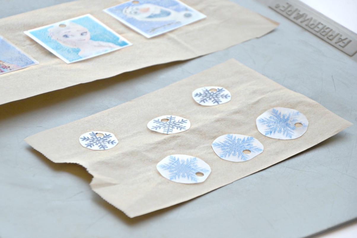 Print the 5 x 7″ FROZEN Charm Necklace printable on shiny side of shrink film. Please note shrink film instructions advise drawing on non shiny side with permanent markers or pencils. Do not follow package instructions as the ink will print blurred on the non shiny side. Ink will be wet so carefully cut around the designs and place a hole punch at the top center of each charm. Place printed side up on brown paper and then on cookie sheet.