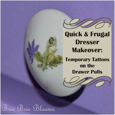 My childhood dresser moved to college with me and many years later was refinished and painted purple for my daughter’s nursery. The nursery was jungle themed and at the time I had purple hippo drawer pulls on the dresser. The room transitioned into a big girl Nemo themed room and I changed the drawer pulls again. For the new princess room, I used the existing drawer pulls and updated them using princess tattoos.