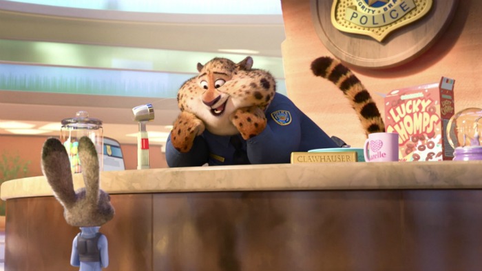 4) You’ll notice many different film and show references in Zootopia but you’ll also notice the fun play on real products too. Officer Clawhauser enjoys Lucky Chomps at his desk while a very busy Zootopia enjoys their morning Snarlbucks coffee. Clark said the team had quite a bit of fun with these references.