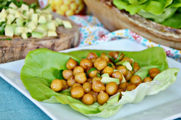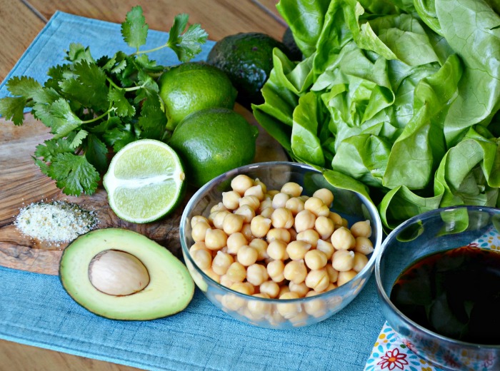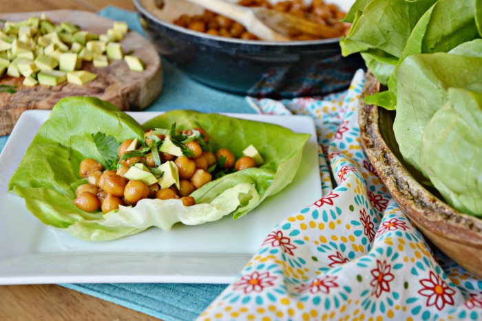 Place a spoonful of cooked garbanzo beans on lettuce leaf. Garnish with avocado and cilantro.