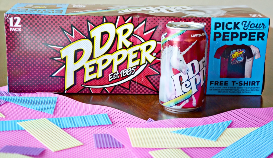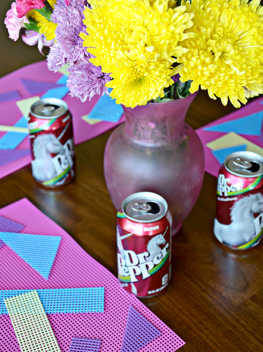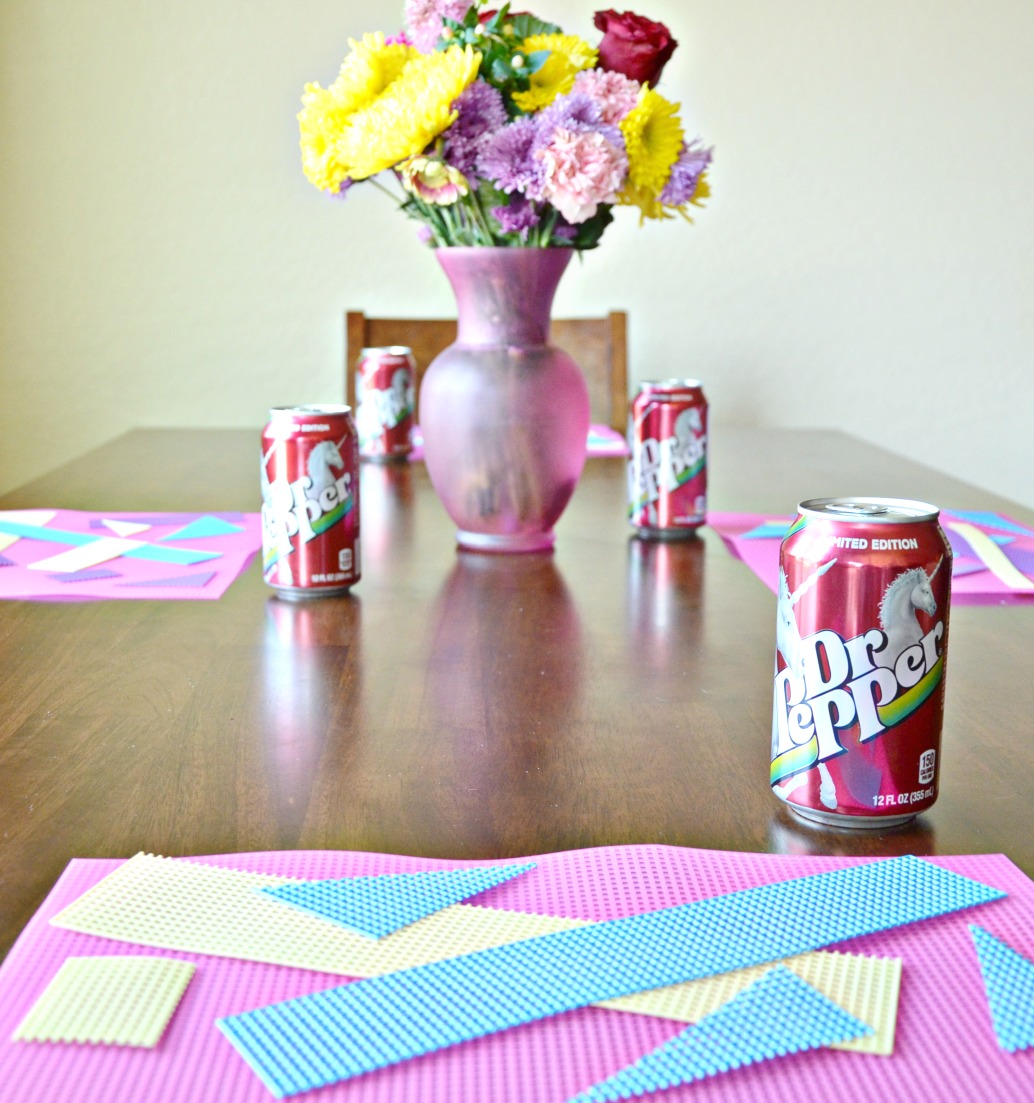 This summer has been hot, really hot. We’ve already seen 120° and have spent every afternoon in our backyard pool trying to cool off. When it’s too hot to be outside we have been indoors trying to stay cool with summer crafts. Dr Pepper® is adding to our summer craft inspiration with their new “Pick Your Pepper” designs. Pop art, sharks, unicorns and more are bright, festive and fun – just what you need to add some color to your summer parties! We recently picked up a box of unicorn cans and made geometric summer placemats to keep us smiling through this ridiculously warm Arizona record breaking heat wave.