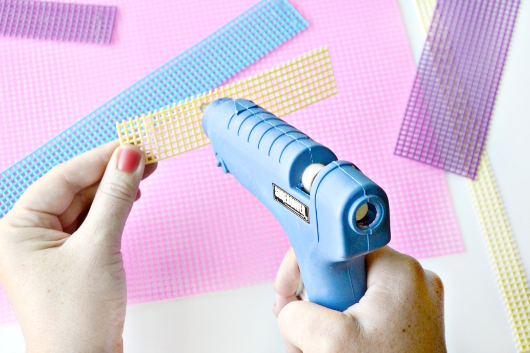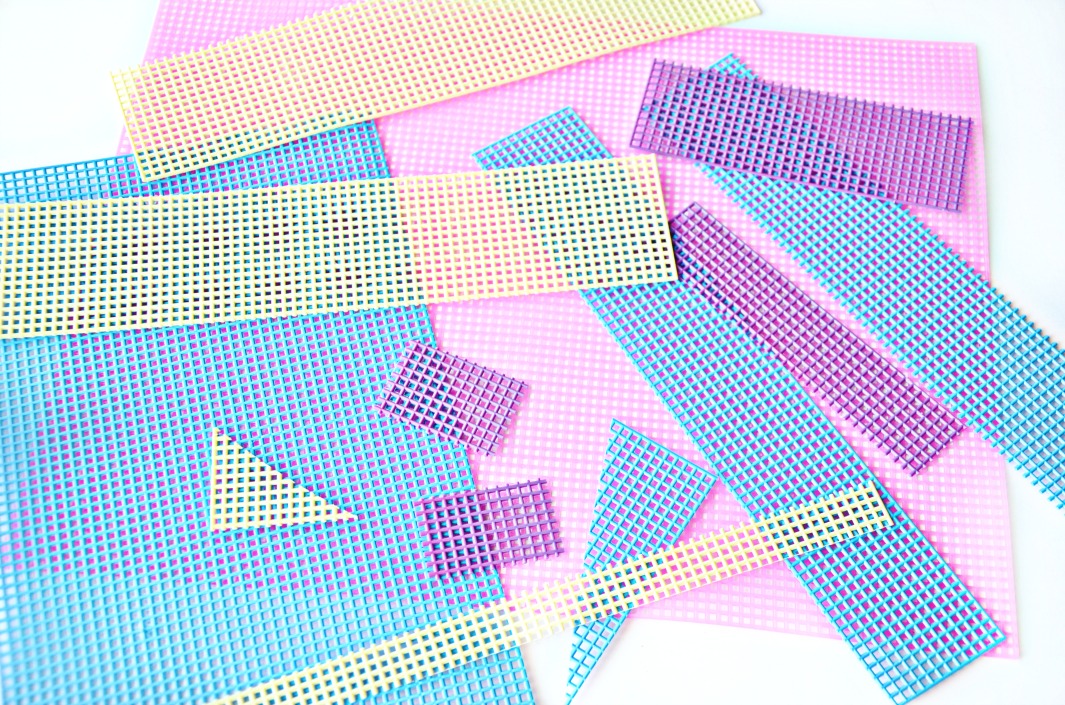Set aside full set of mesh plastic canvas sheets for placemats. We made a set of hot pink placemats but these would be fun mismatched for summer too. Cut several other brightly colored sheets into geometric shapes. There are no rules – cut short, long, wide, and thin varying shapes and sizes.