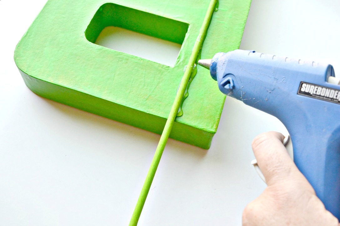 Use glue gun to carefully attach bamboo skewer to back of letters.