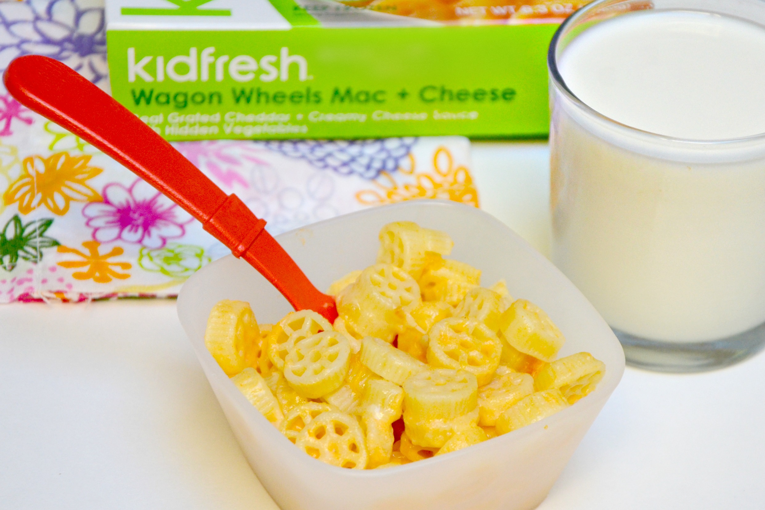 The Kidfresh Wagon Wheels Mac + Cheese are also a favorite. They have a super secret ingredient too – carrots! They are made with real grated cheddar, creamy cheese sauce and hidden vegetables.