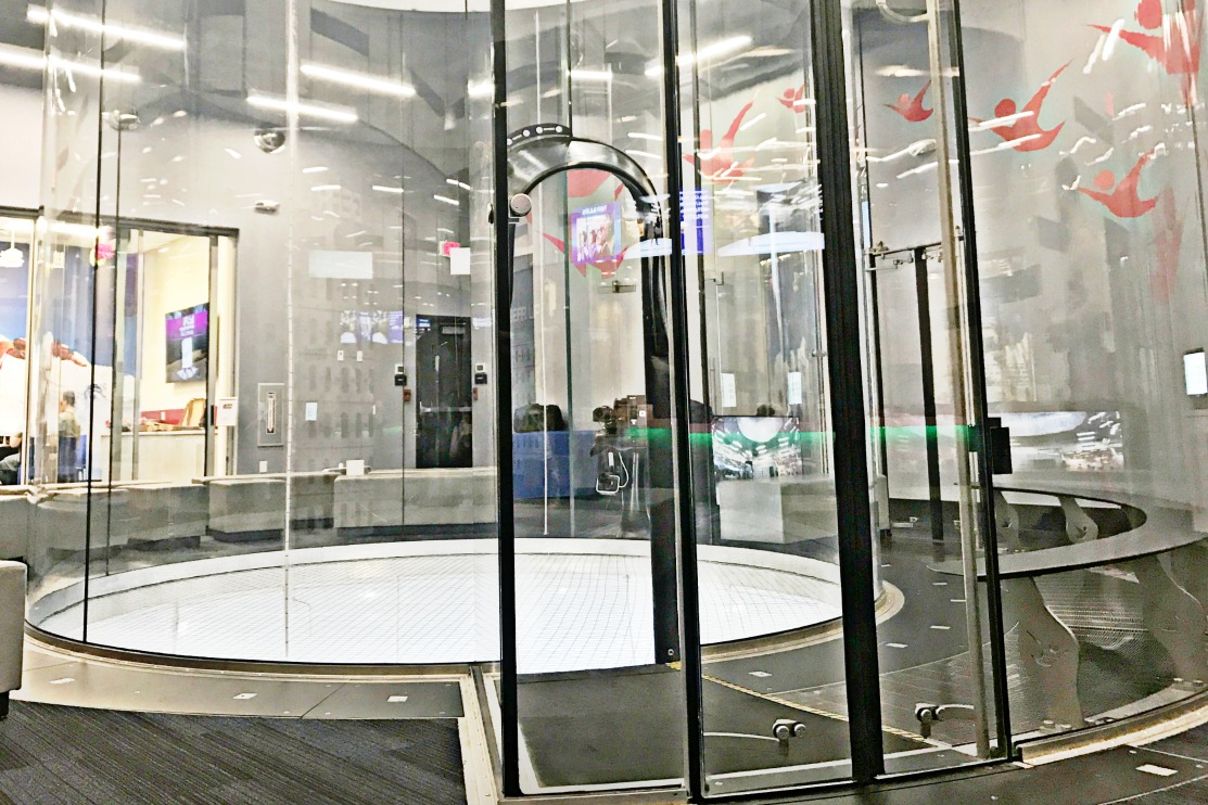 After the quick check in process, we went upstairs to the flight deck where we observed the wind tunnel. The vertical wind tunnel is a large enclosed tunnel with fans at the top to draw air through the flight chamber. The smooth column of air creates a safe environment to comfortably fly.