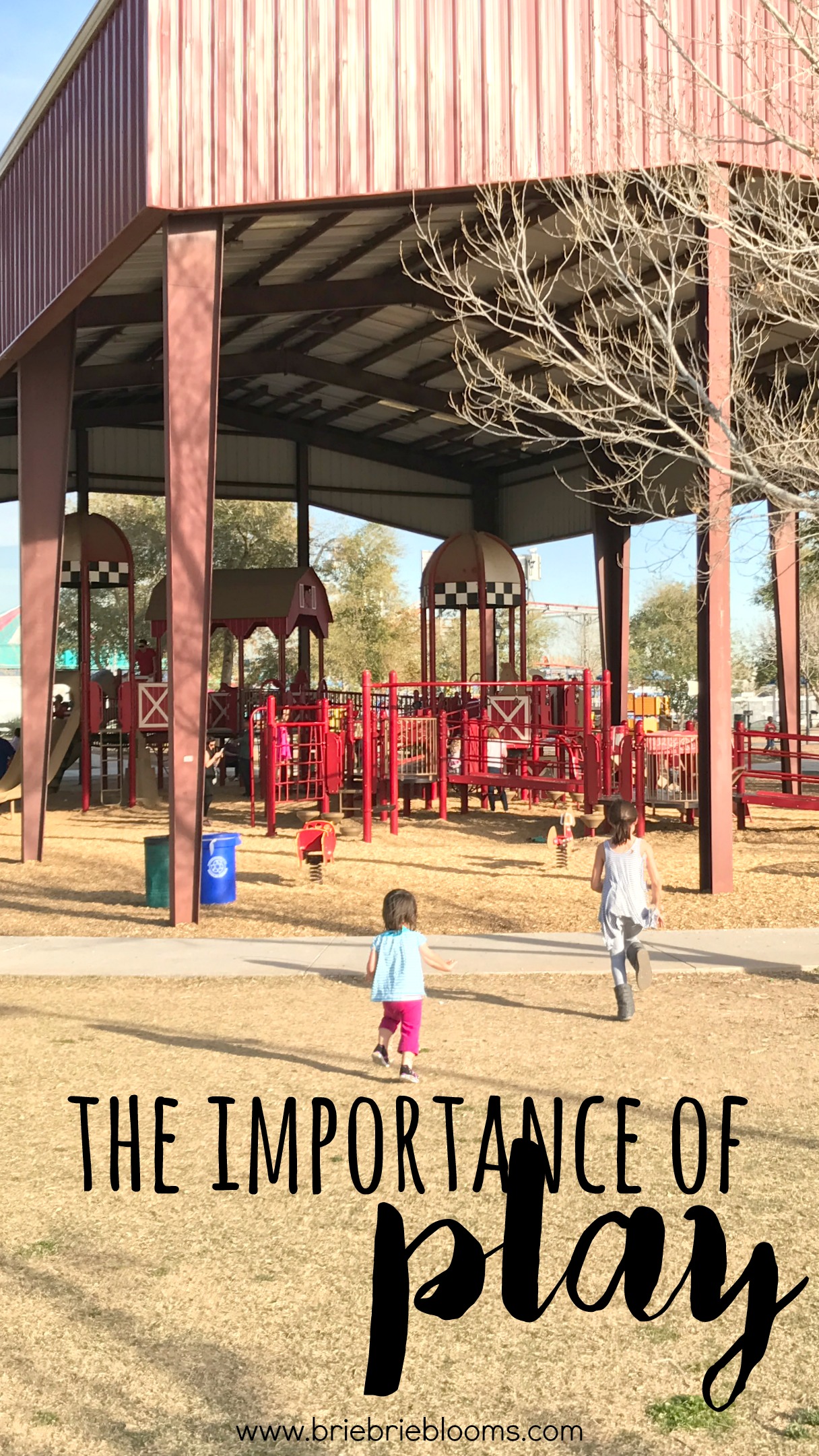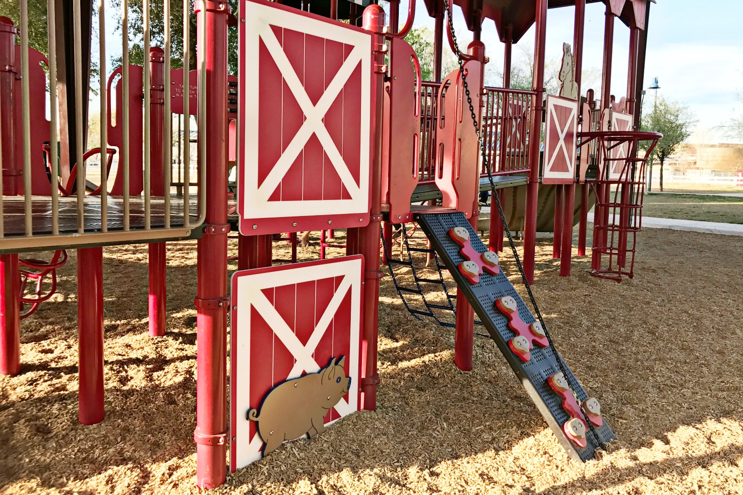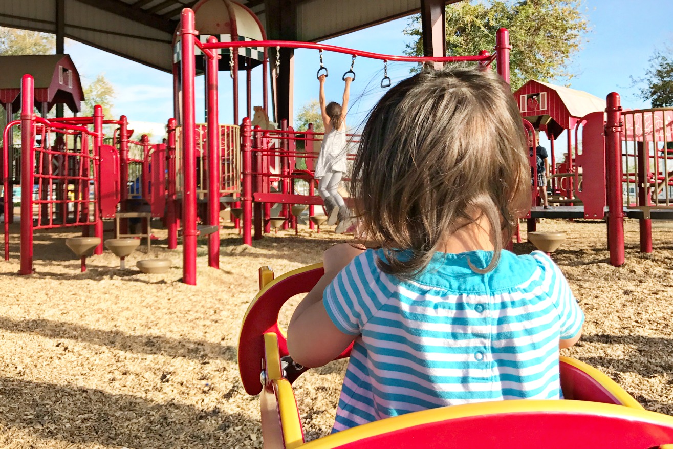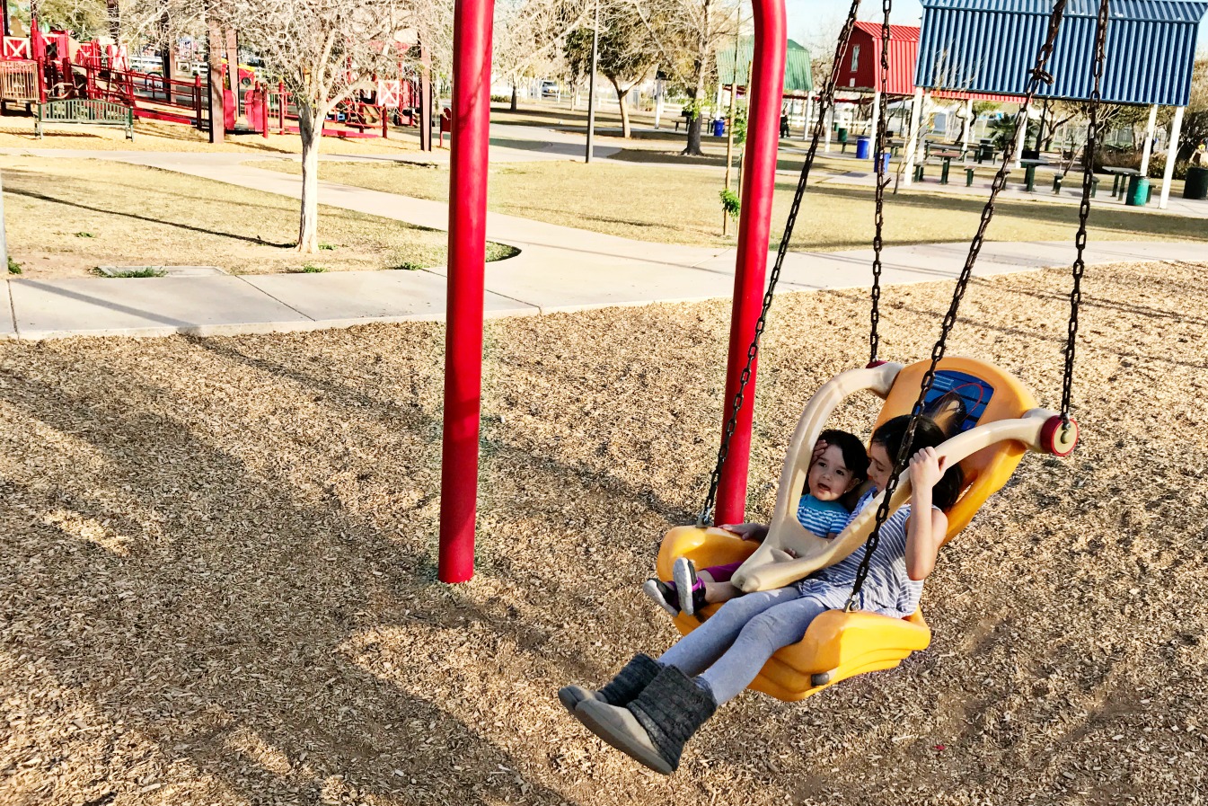In Arizona we have year round park weather so my daughters play outside often. We live by quite a few nice public parks and our very favorite is the City of Chandler’s Tumbleweed park. The Landscape Structures playground has swings, climbing structures, slides and more for children of all ages. My oldest daughter has grown up playing at this park and now she loves playing with her younger sister there too. Playgrounds are a place for play but it’s also where important learning takes place for all ages. The importance of play is recognized and why we prioritize time to visit the park for playtime.