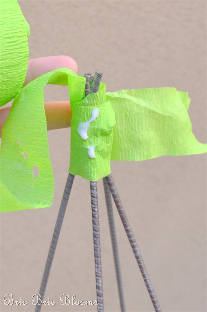 Continue wrapping the streamer around the entire wire cage. Add a few random spots of glue to hold the streamer in place.