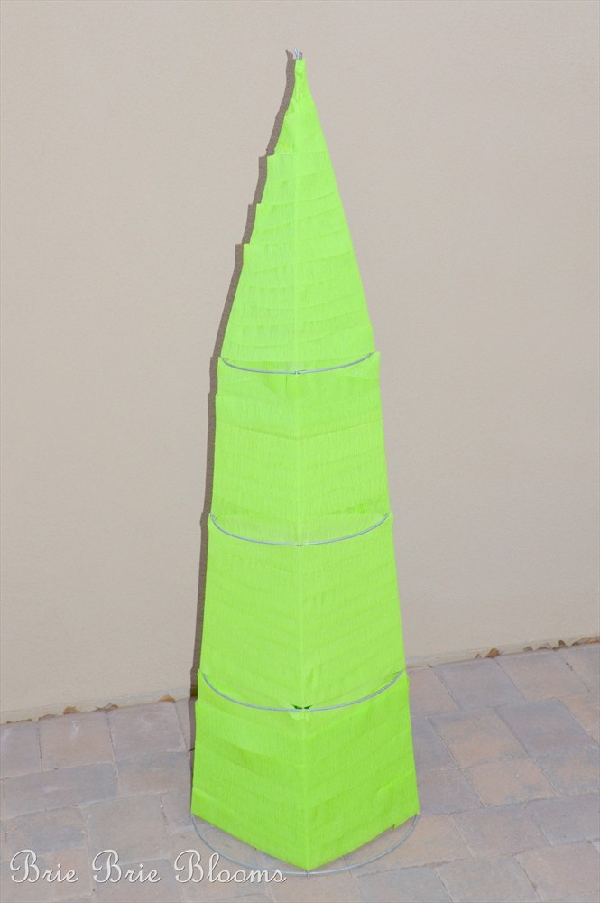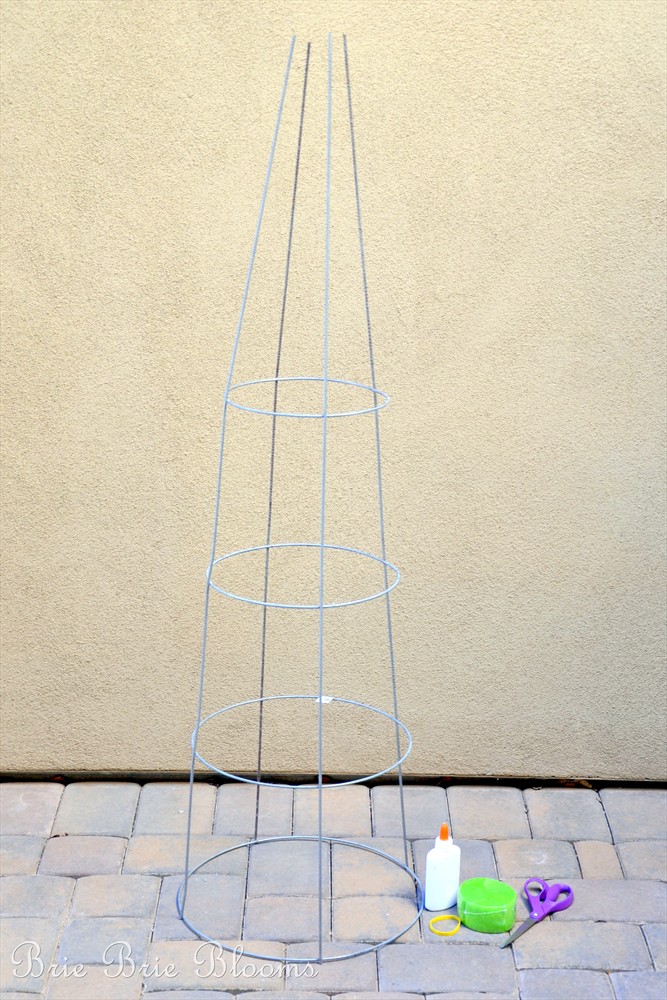 The entire tree cost $7 to make ($4 tomato cage, $2 streamers, $1 garland).