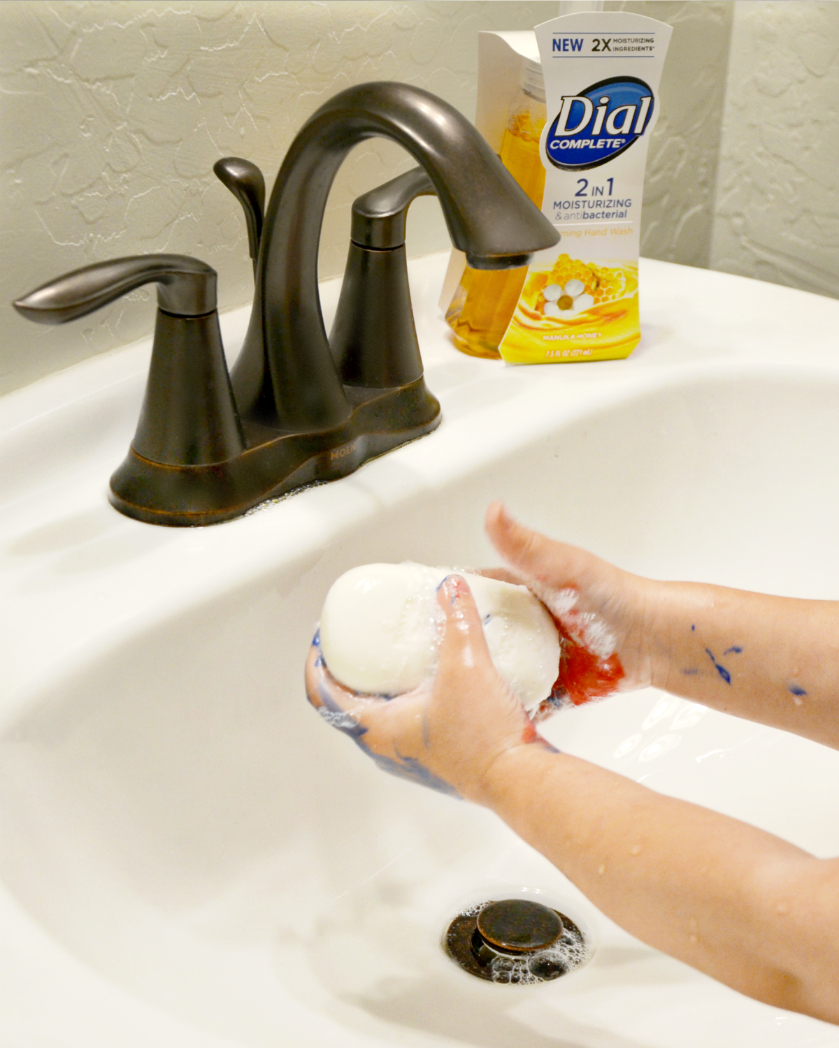 We walked very carefully not touching any furniture, pets or walls on our way to the restroom for a good hand washing with Dial®. The unique nourishing formula from Dial® gently cleans and moisturizes leaving skin feeling huggably soft and beautiful, exactly how we want little sister to feel after a good messy craft project.