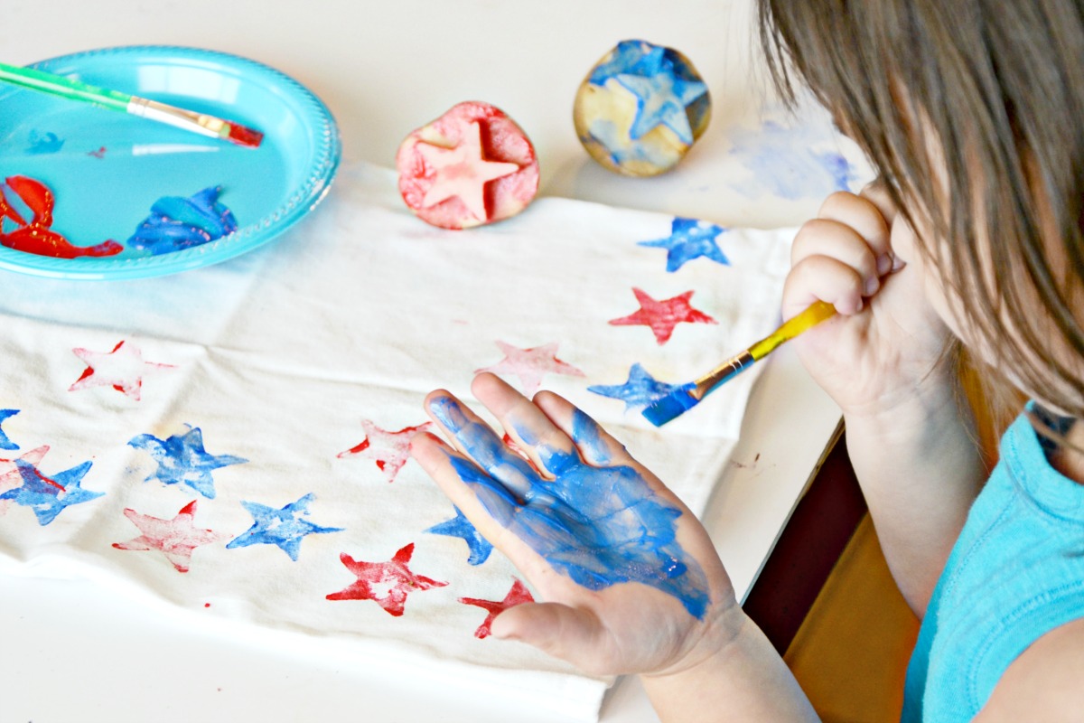 Use a paintbrush to paint the shape then stamp on your shirt. My youngest daughter loved this activity and very carefully placed her stamps on the shirt.