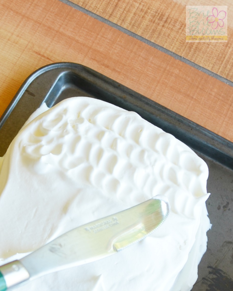 Remove cake from freezer and top with remaining whipped cream. I used the tip of a butter knife to gently add some texture to the topping. This quick detail gave the cake a finished look. Freeze for additional three hours.