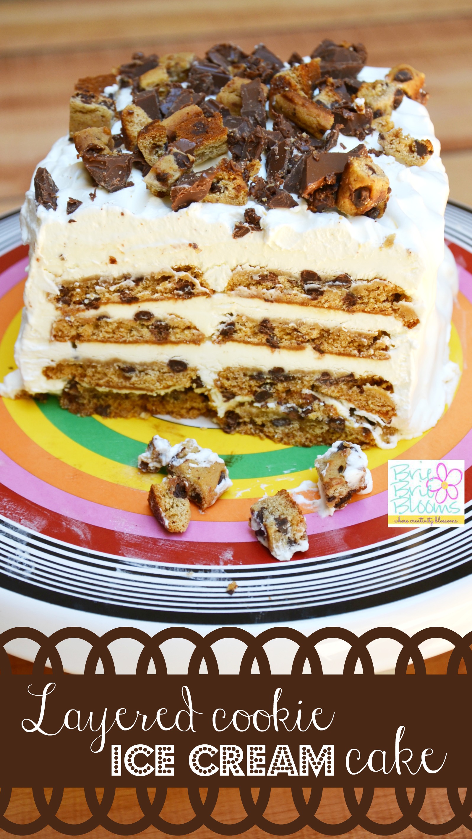 When I saw the Spoonful Chocolate Chip Ice Box Cake Recipe I knew I needed to make it for an upcoming barbecue. I made a few changes to the original recipe and was thrilled by my pretty layered cookie ice cream cake! It was popular at the barbecue and I’ve already had follow up requests from my family. The layered cookie ice cream cake recipe is easy to follow, delicious served with cookie dough ice cream, and will definitely be a new summer dessert favorite!