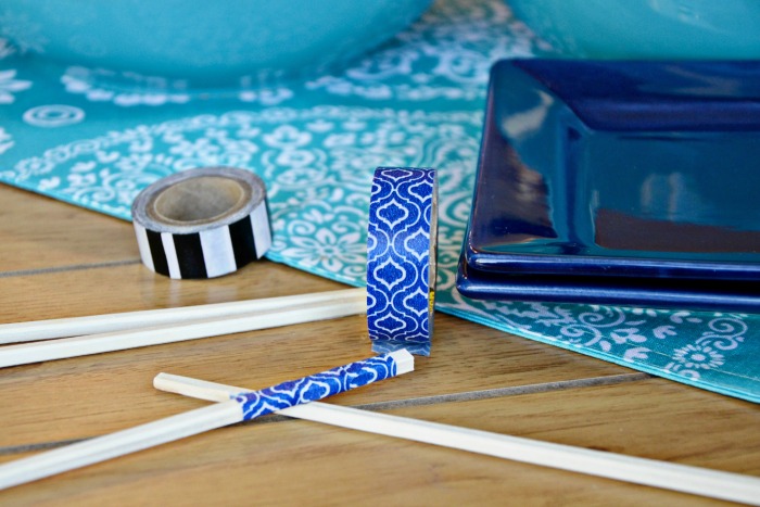 The craft can be made with different tapes for family fun or you can use matching tape to dress up your chopsticks to match your table setting.