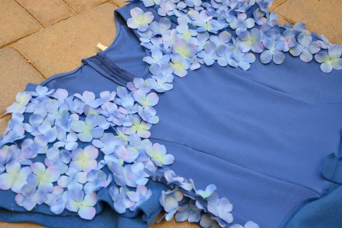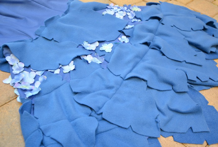 Cut large fleece leaves and use a sewing machine to stitch two layers along bottom of dress and waistline. The placement was not precise and I wasn’t careful as I quickly stitched them to the dress. Use hot glue to place flowers between leaves on dress.