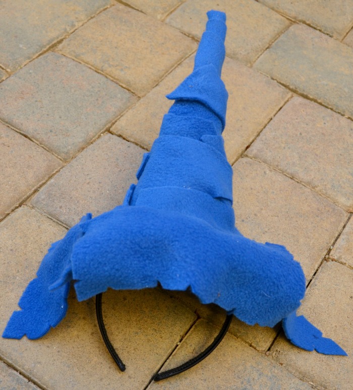 The hat was made by wrapping fleece around a witch hat headband. I made the hat taller by securing a straw to the top of the hat before I started wrapping it with fleece. Carefully secure the fleece edges with hot glue. I also cut a few leaf shaped pieces of fleece to add to the hat.