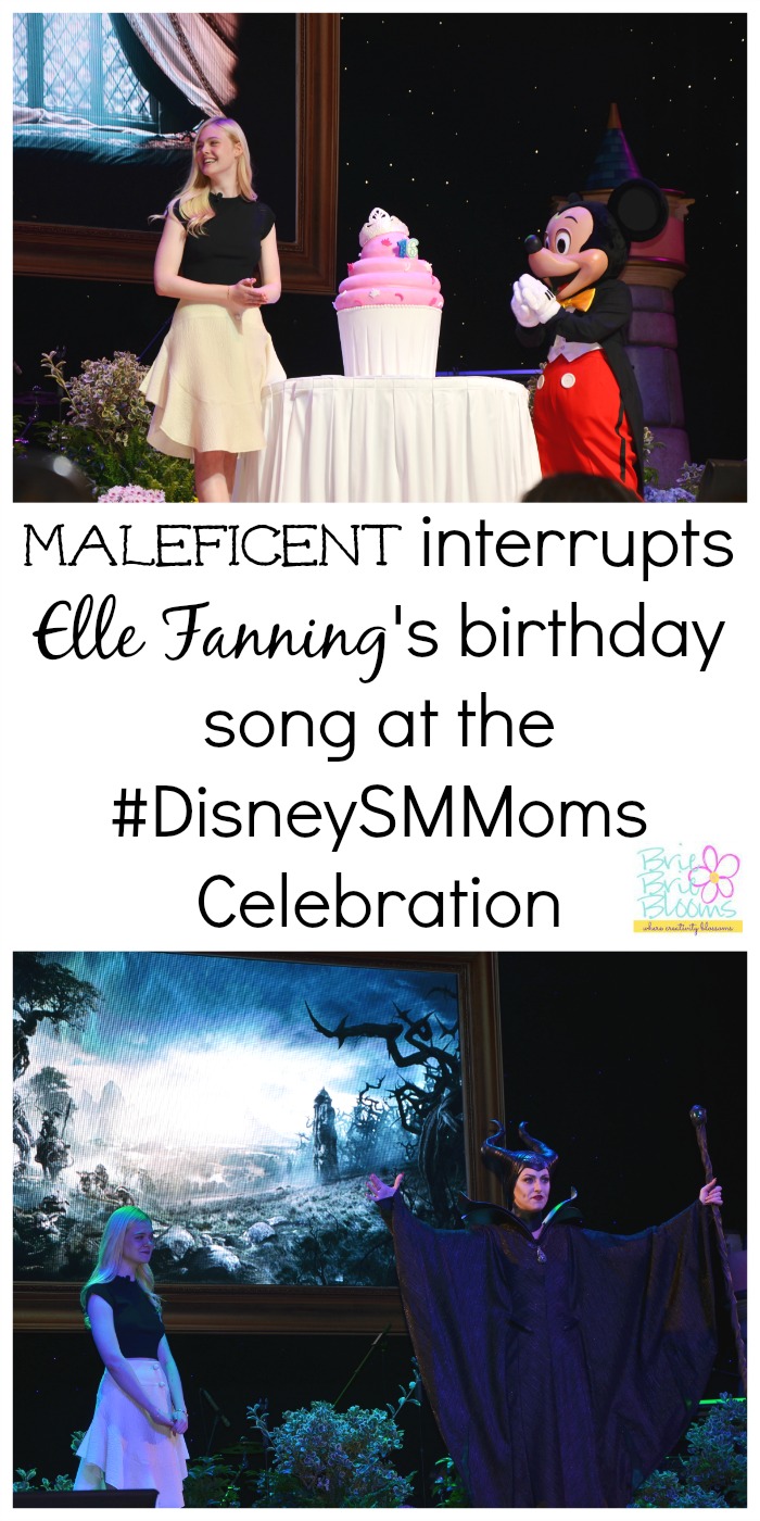 Attending the Disney Social Media Moms Celebration at Disneyland was an amazing experience for my family. With so many unbelievable opportunities and experiences during the four day conference, it’s challenging to select our favorites. There was plenty of excitement during the week about Maleficent starring Elle Fanning as Princess Aurora and Angelina Jolie as Maleficent with the movie being released in theaters May 30. During a morning sponsored by Disney Junior we were treated to a very special surprise. Elle Fanning arrived to the stage to talk about her role in the movie. Her elegance and humble spirit were notable and she spoke well beyond what you would expect from a teenager. Elle had her 16th birthday just a couple of days before she visited Disneyland and we were able to sing a birthday song and share cupcakes to help her celebrate. Our morning became even more magical when Maleficent interrupted the celebration just before we began the birthday song.