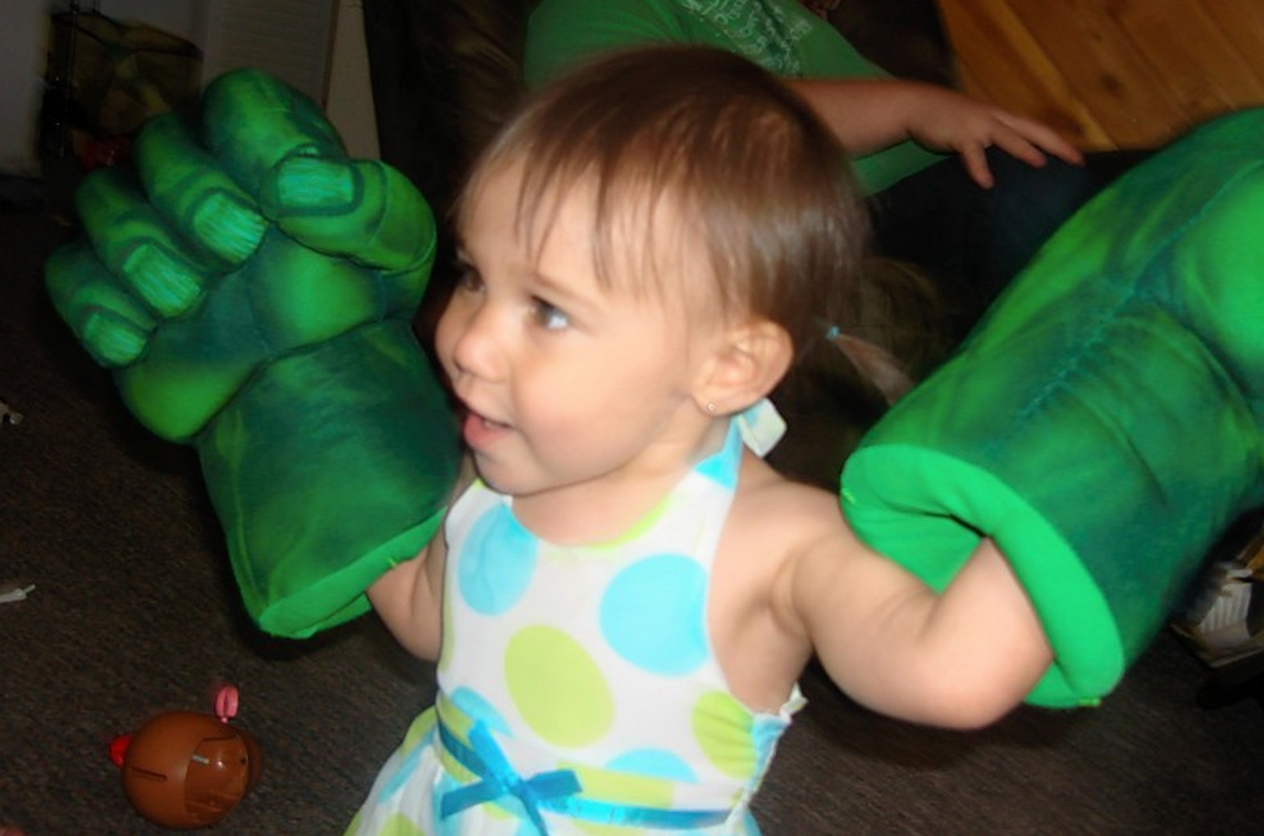 It all started with our daughter’s obsession with pretending to be The Hulk at just one year old. It’s hard not to laugh looking at this picture of her so many years ago.