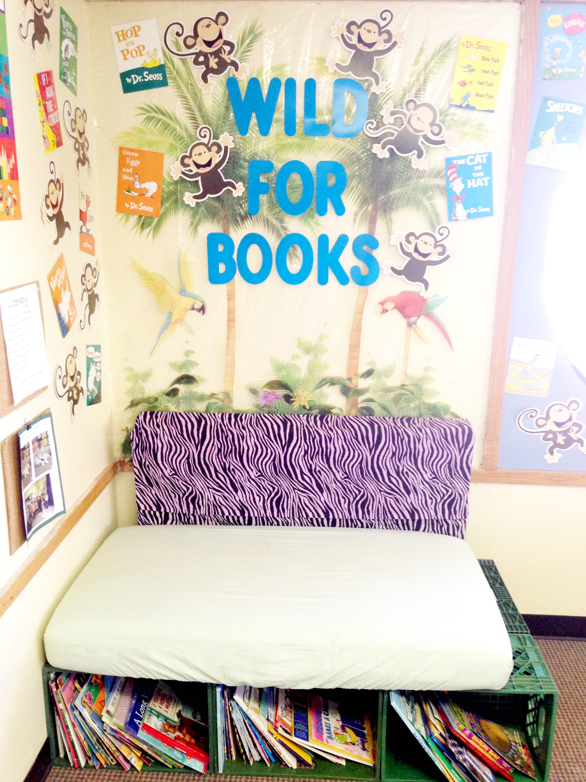 Place the crib mattress on top and arrange your favorite books in the crates below. I used four soft pillows to create a back to the bench in my daughter’s playroom. The back to the bench in my classroom was made with a large flat rectangle box covered in fabric. The no sew project used hot glue to attach the fabric to the cardboard box.
