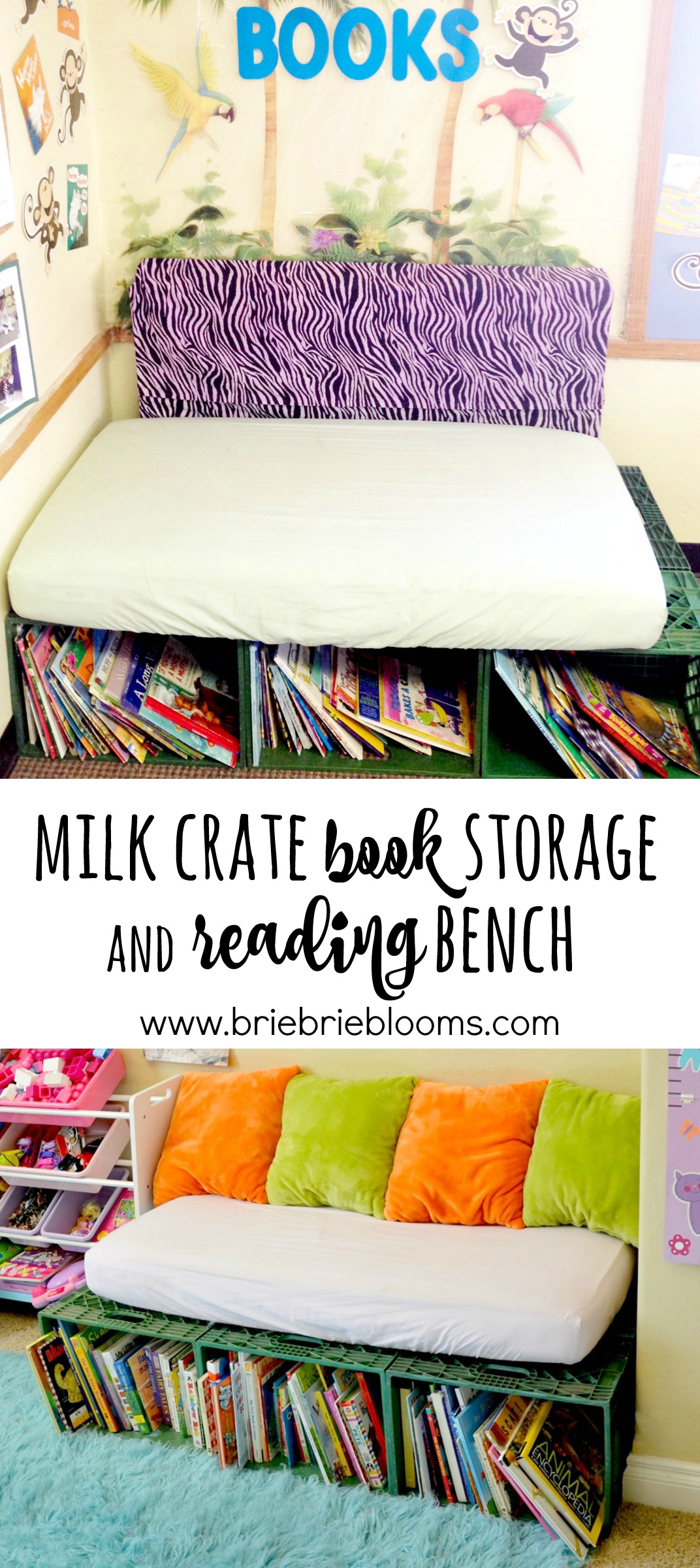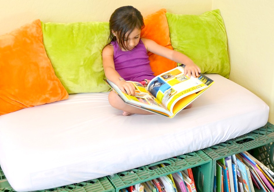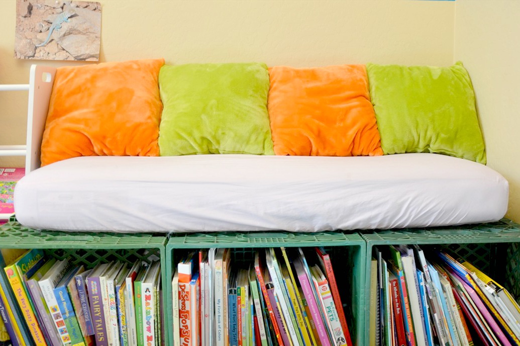 Arrange five milk crates on the floor with the openings facing outward. Place the sixth milk crate in the middle to support the bench. If the bench is in a classroom, the space under the mattress is perfect for storing holiday or themed books when not in use to make rotating books a quick process.