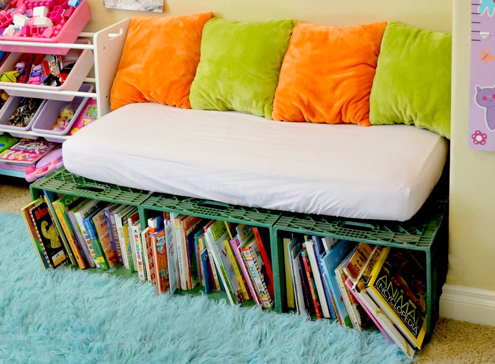 Enjoy an easy DIY book storage solution with this milk crate book storage and reading bench. This post was originally published September 1, 2013.