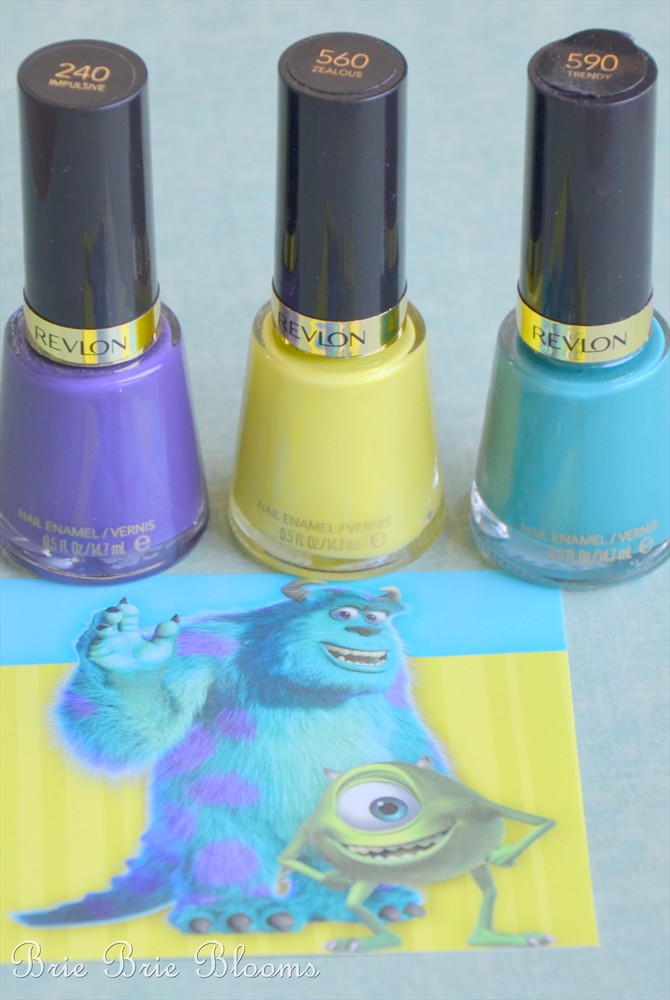 I used three different Revlon nail polishes to create my Monsters University nails: impulsive, zealous, and trendy. The colors were almost a perfect match to Mike and Sully.