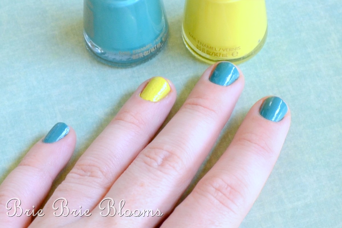 I started by painting all but one accent nail blue (trendy). I used the bright green (zealous) to paint one accent nail on each hand.