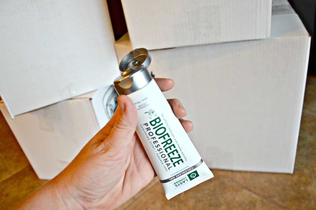 We will be moving fully out of our current home and into our new home in less than three weeks. Our moving to do list is quite long but for right now all it really includes is packing boxes, packing more boxes, moving those boxes, unloading boxes and repeating over and over and over. I feel like the end is in sight but the toughest part has just really started. Hello muscle pain. Biofreeze® Professional pain reliever products do not require a prescription and are as effective as using ice for treating pain. I certainly don’t have time to ice anything and have to keep moving in this fast process so carrying around a drippy ice bag isn’t a favorable option at this point either.