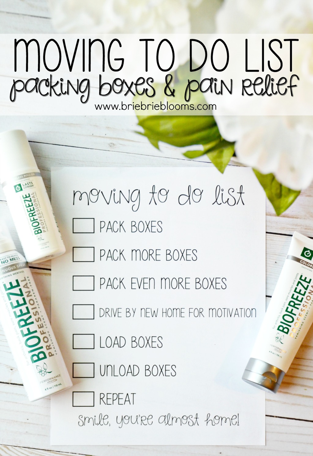 In the last 30 days we went from simply considering selling our home to getting it ready to list for sale then actually selling and preparing to move. Our home was only for sale five days when we accepted an offer. Everything about the process has been fast moving and just like the last time we moved, has caused many vows to never move again. This is certainly an exciting time for us but also the busiest. Staging our home and hosting open houses, completing all the paperwork and information for the realtors and loan processors, inspectors, appraisers, home repairs, packing and finally moving has been exhausting. Sleep and rest is not something we’ve been able to incorporate into the schedule and I’m pretty sure my body has been quietly keeping count of all the boxes I’ve packed, loaded and unloaded. I’m ready for a break but know it’s not anywhere near the immediate future so I’m turning to Biofreeze® Professional pain reliever products to help out my sore muscles until we get settled. My moving to do list includes packing boxes and pain relief this week.