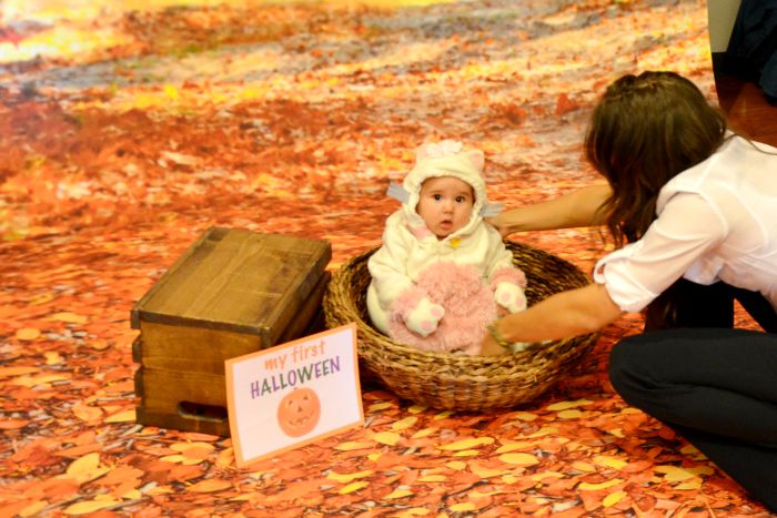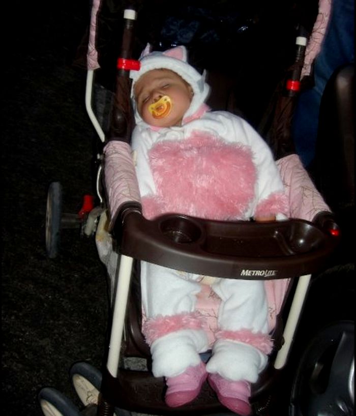 Although we do have some cute photos of my older daughter in her first costume, I remember the challenges of getting photos in costume during trick or treating and other Halloween events with a baby. Babies are unpredictable. Without carefully planning your costume photos, you may just end up with a sleeping baby in a stroller instead.
