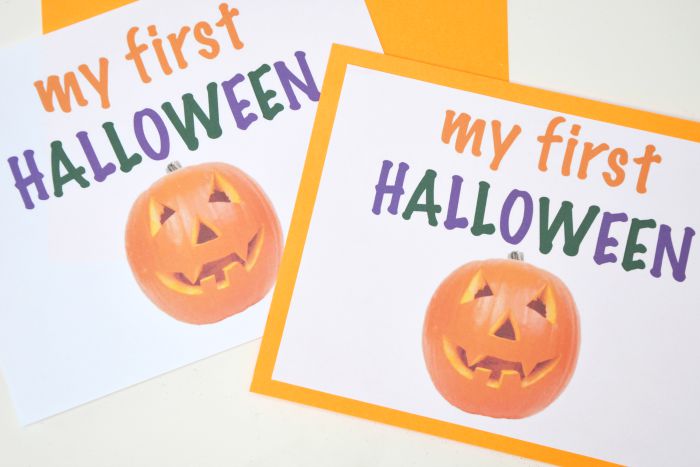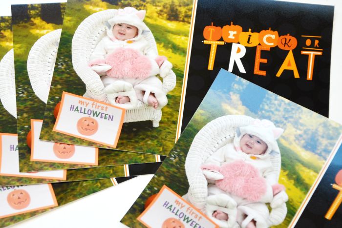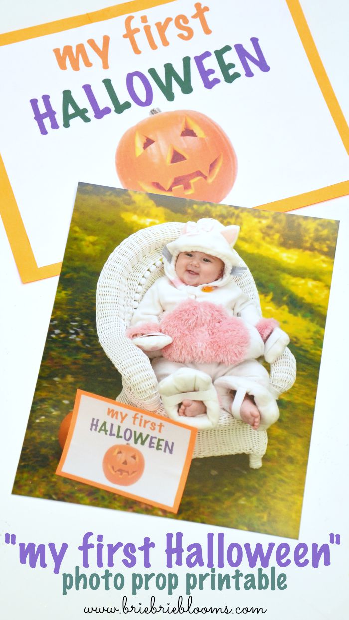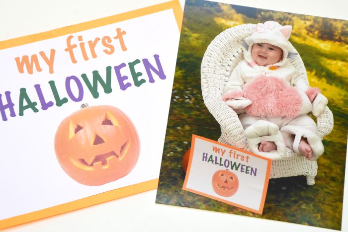 Portrait Innovations prints your photos immediately following your studio session so I wasn’t concerned about having to wait for an order to mail to family and friends prior to the holiday. I actually just called yesterday morning and was able to schedule an appointment for photos that afternoon. I printed the “My First Halloween” printable and glued it to orange cardstock. Baby sister drools on everything so I brought a few copies with me to the photography session.