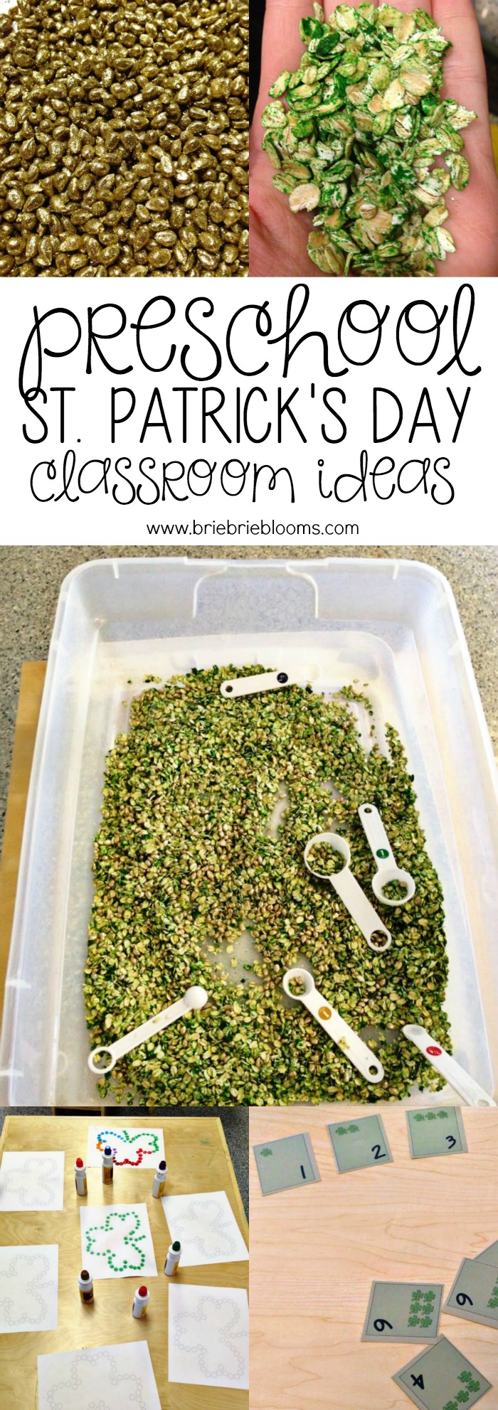 Combine green oats and gold kernels in your preschool classroom St. Patrick’s Day week sensory tub. Add measuring tools for all day play and exploration.