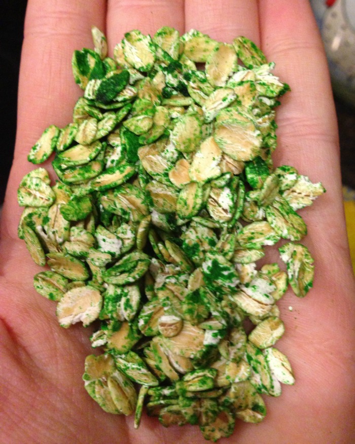 In large sealed plastic bag, shake oatmeal and vanilla or rubbing alcohol. When oats are fully equally coated, open bag and add several drops of green food coloring. Reseal bag and shake until oats are evenly colored. Spread green oats on cooking sheet and allow to air dry before adding to your St. Patrick’s Day sensory bin.
