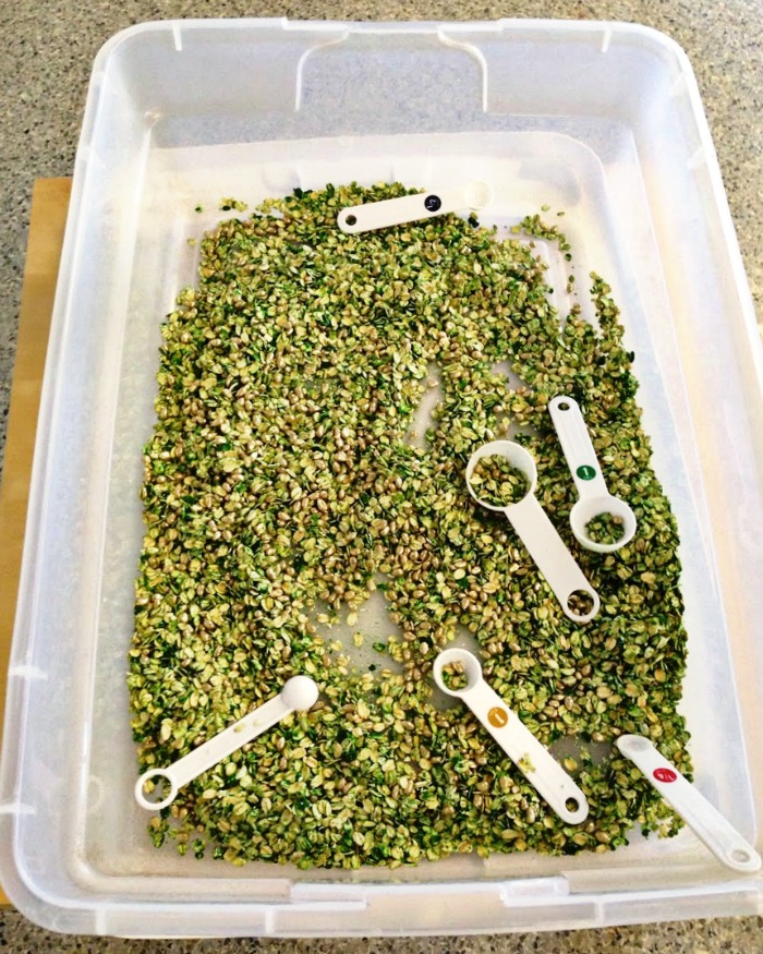 My St. Patrick’s Day sensory bin is a leprechaun’s paradise. Green oats and gold kernels are easy to prepare.