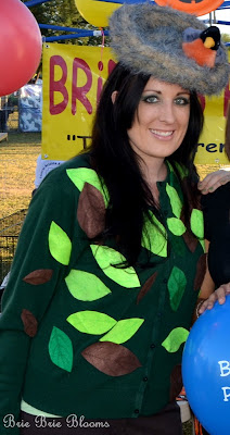 I wore brown pants to go along with the tree theme but this would also work with green pants or jeans. My costume was very popular with little kids once they learned my bird could chirp!