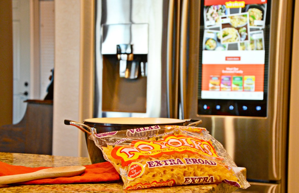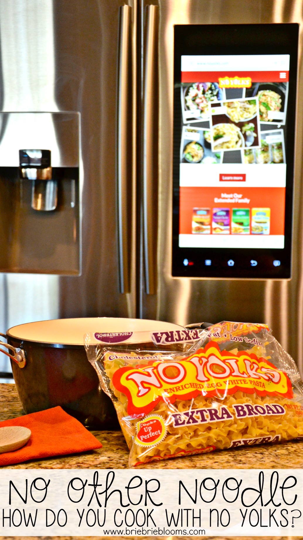 In our new kitchen, thanks to the previous homeowners not leaving appliances, we upgraded our refrigerator to something that had been on my ultimate kitchen wish list for years. Now when we’re wondering what’s for dinner, we can look up No Yolks on Facebook, Instagram, or Pinterest right from our refrigerator door. This week we’ll be stepping out of our normal egg white noodle comfort zone and creating something different for dinner. How do you cook with No Yolks?