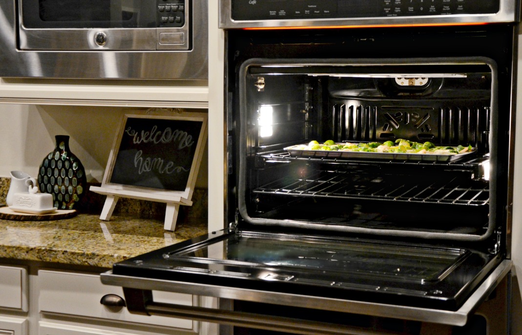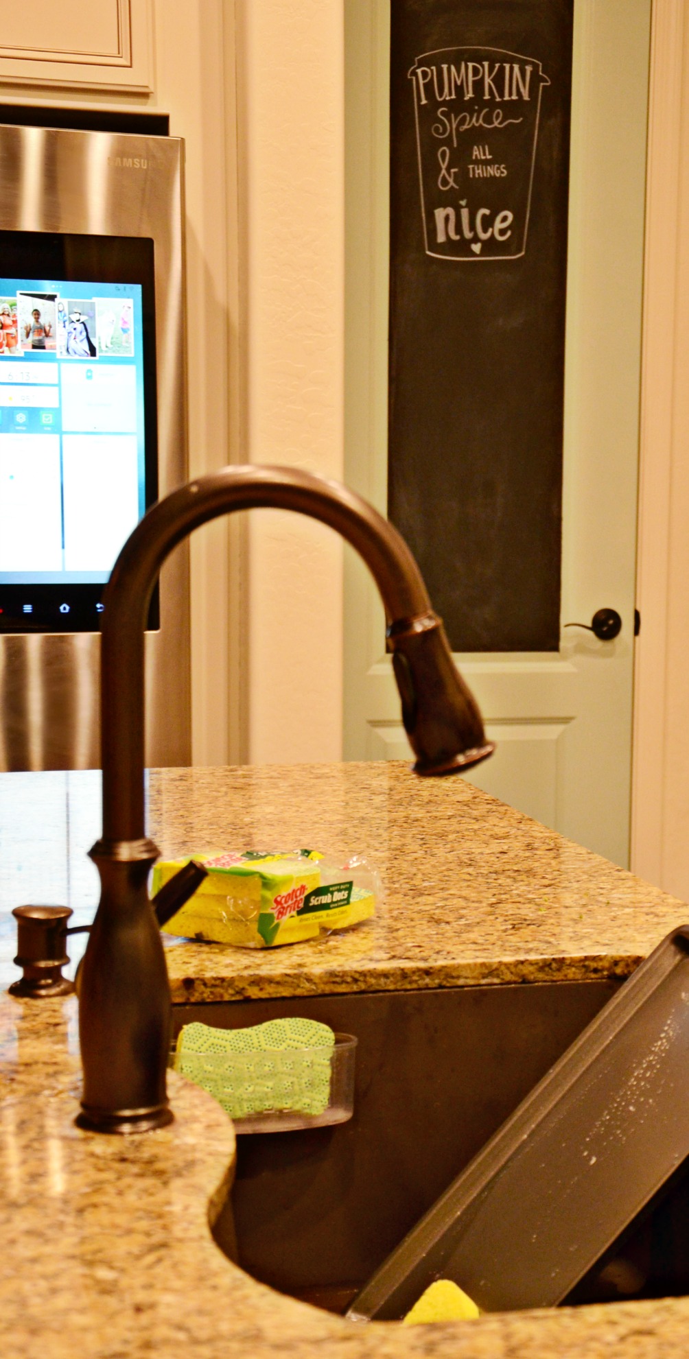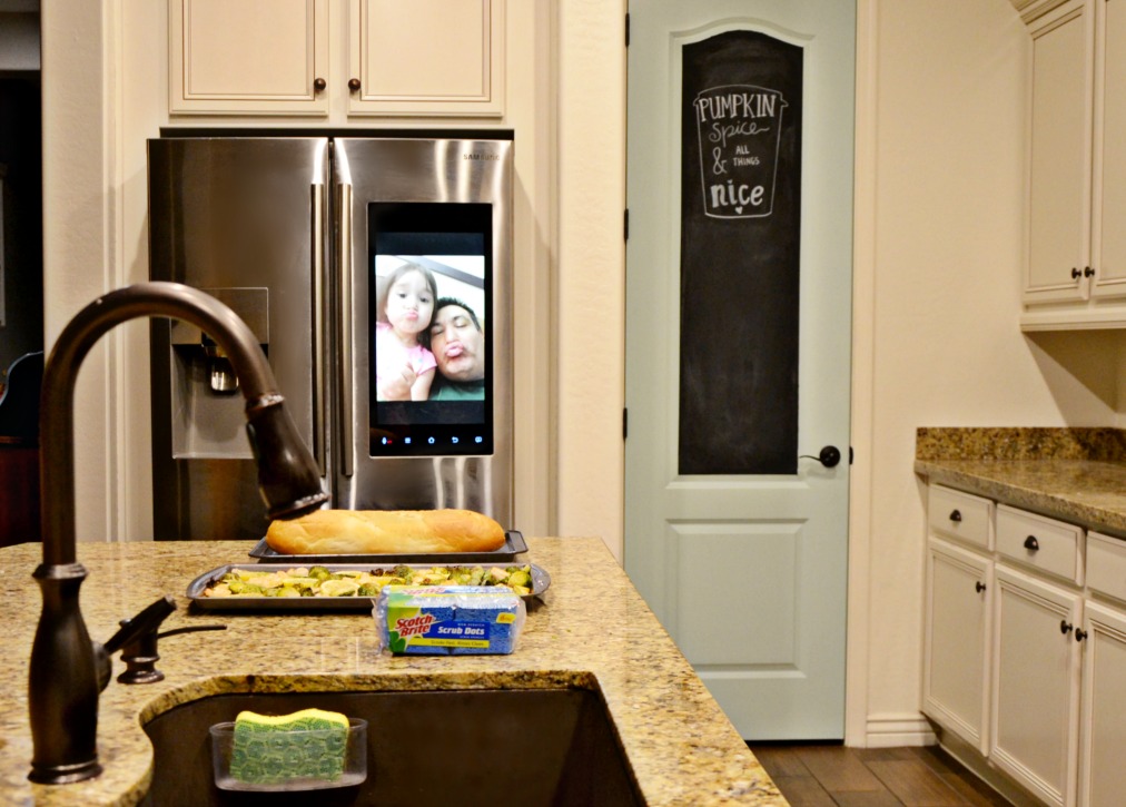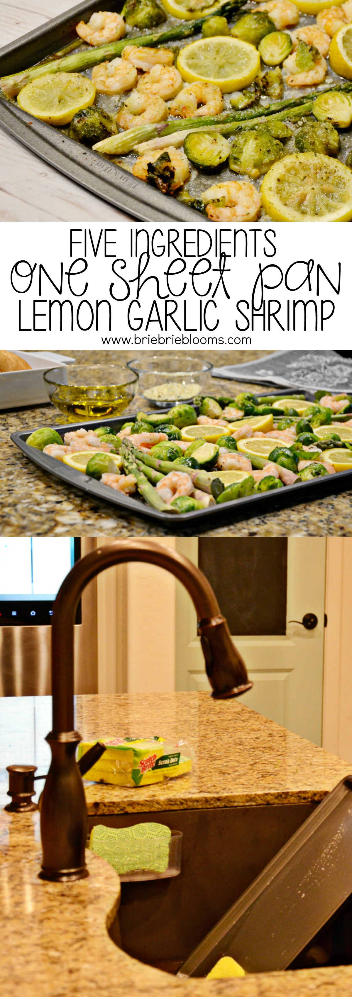 We’re finally getting settled in our new home and only have a handful of boxes left to unpack. The kitchen was the very first room to get fully unpacked and it’s been a favorite place to spend early evenings. Just this week I stopped what I was doing to breathe in a moment I truly could not have imagined as anymore perfect. The fall weather has our Arizona temperatures starting to cool and our patio doors were open with both my daughters outside playing in the backyard with neighborhood friends. New friendships and little girls giggling, crisp fall air and the smell of an incredible five ingredients one sheet pan lemon garlic recipe in the oven created this beautiful moment. Moving was scary for oldest daughter because she wasn’t sure if she would make friends quickly. She was nervous about moving to a street where she didn’t know if there were any children her age. Her fears were quickly overcame as our first week here she learned we live on a street full of girls her age with many common interests (hello slime making in our backyard!). As her mommy, I was quite relieved and have really enjoyed watching these new friendships blossom. Another contribution to my perfect evening preparing dinner in my new kitchen was the one sheet pan lemon garlic shrimp recipe didn’t have me worried about the cooking mess because our kitchen is fully stocked with Scotch-Brite® Scrub Dots from Kroger for the ultimate fast kitchen cleanup. You might have already seen me oversharing my love for our new appliances. Our silly photos scrolling across our new refrigerator door while streaming music also helped to create the perfect ambiance in the kitchen.