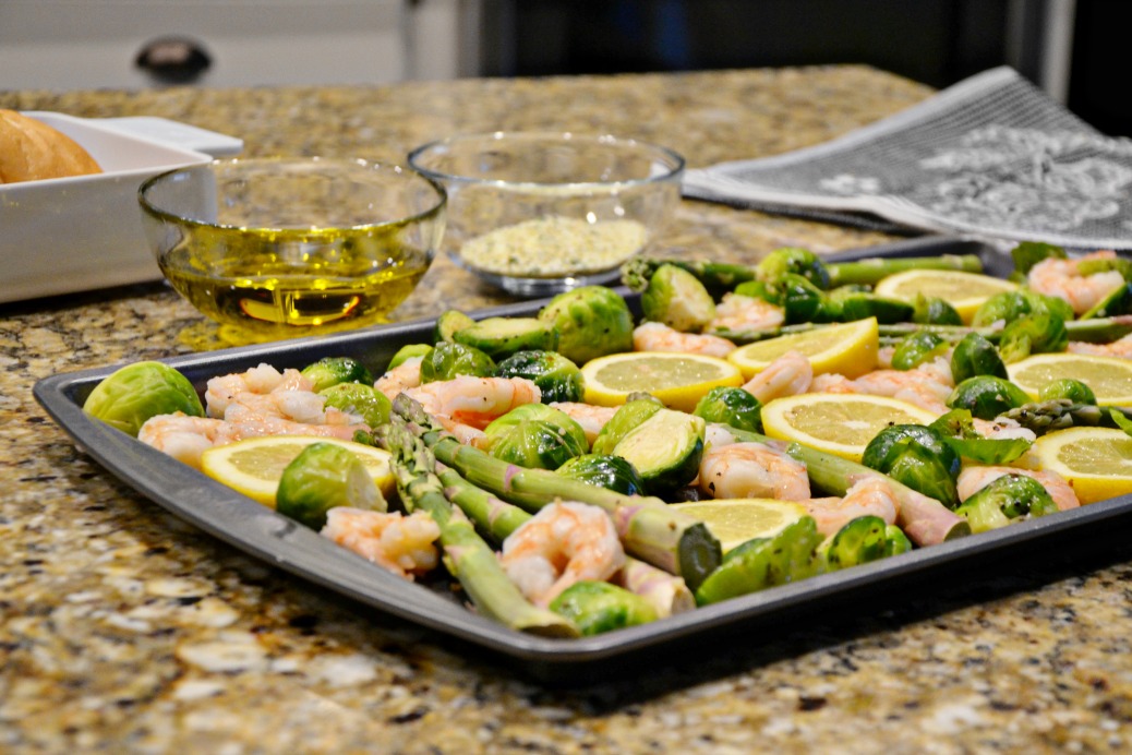 Our favorite fresh vegetables change seasonally and this easy one sheet pan meal can be made with many different variations depending on your vegetable selection. We used asparagus and brussels sprouts in the recipe this week.