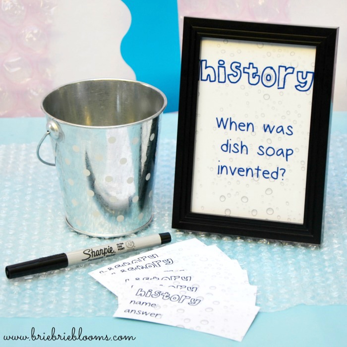 A pop quiz is always a surprise at school. Our back to school bubble party pop quiz had everyone talking about dish soap! Party guests had fun learning liquid soap was first patented in 1865.