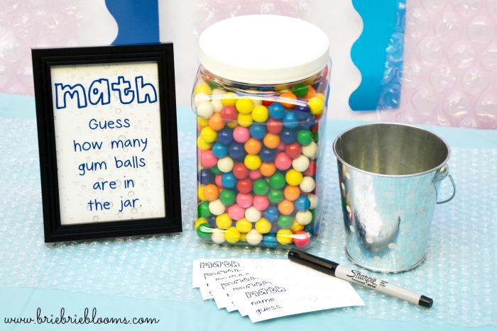 The party table backdrop was made with bubble wrap and blue wavy bulletin board trim. The tables were covered with blue tablecloths and bubble wrap runners. The back to school bubble party was full of activities covering every school subject including art, history, math, P.E, recess, and science.