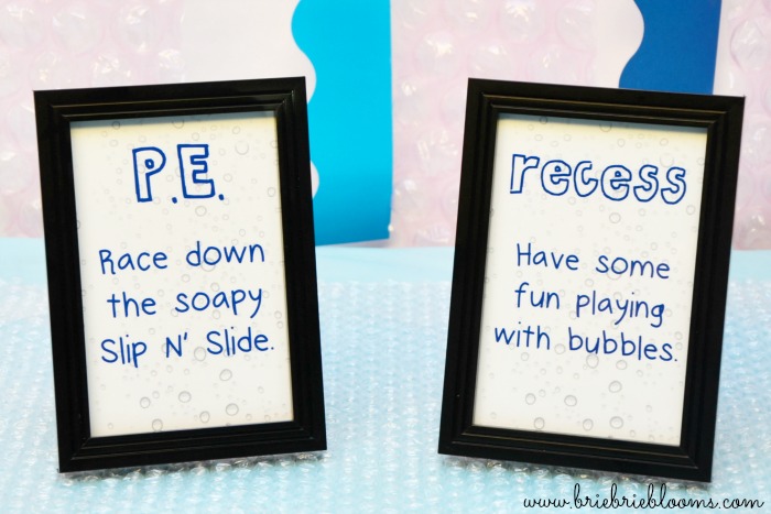 We invited friends over for an afternoon party with activities for every school subject. The invitations were simple and let friends know to expect fun with bubbles.