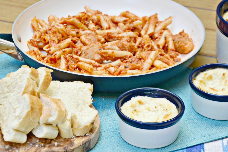 Chicken parmigiana & penne, fresh bread and warm parmesan ricotta dip – dinner is served!