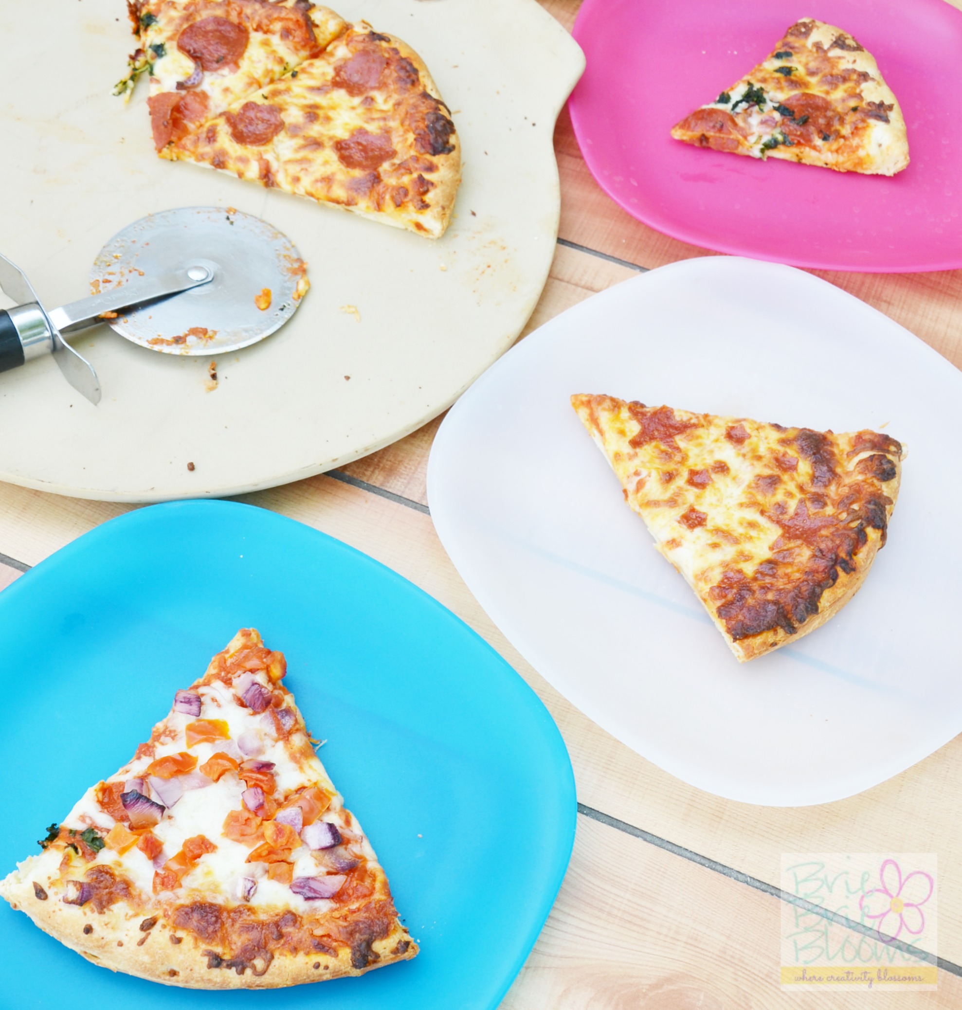 My daughter is graduating from preschool this week and we had family pizza night at home to celebrate. Design-A-Pizza was the perfect meal for our fun family time celebrating the final week of school. I used small cookie cutters to make pepperoni shapes for my daughter’s slice of pizza.