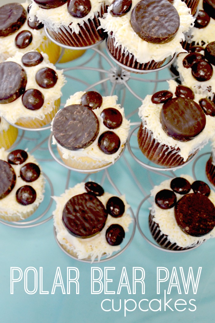 With a larger group and not wanting to exclude parents, I added two dozen polar bear paw cupcakes. While this is not my own idea, they only took a few minutes to recreate without following a tutorial. I purchased unfrosted cupcakes from my local grocery bakery then frosted with white frosting creating a polar bear fur effect. One peppermint patty and several mint chocolate candies made the paw design.