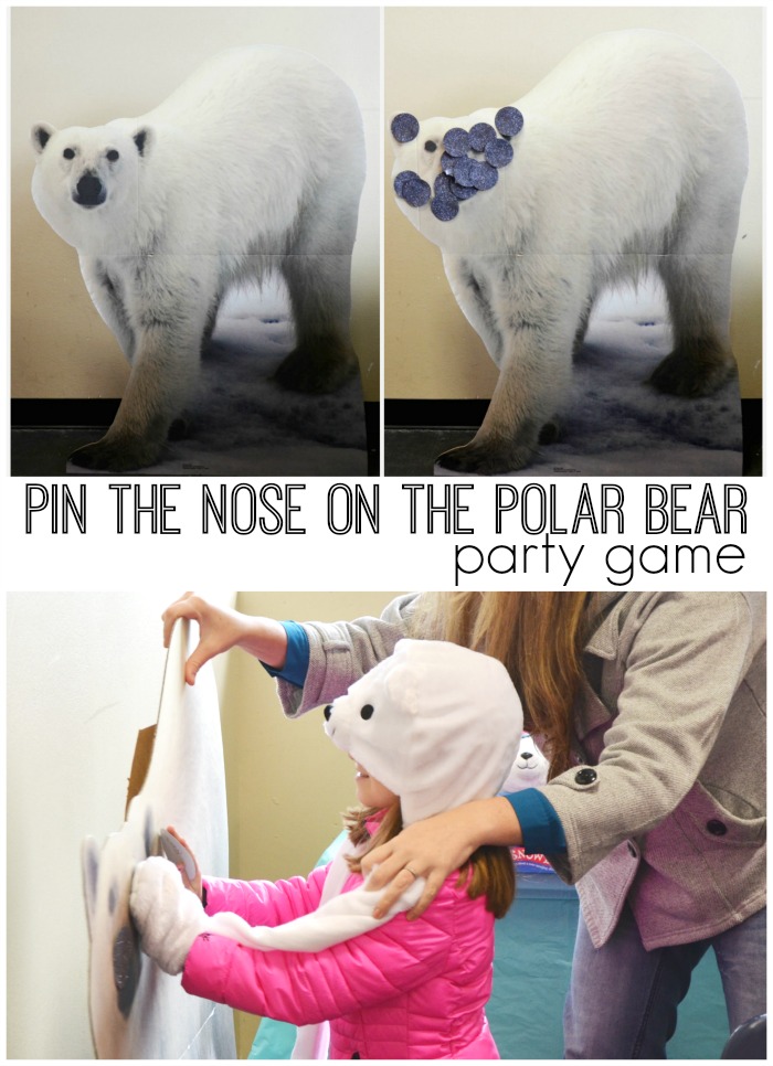We utilized a party room at our local ice rink for a full hour before the children began skating. We ate pizza then had some fun with a polar bear ice skating party game: pin the nose on the polar bear. I used a large paper punch to cut circles of black glitter paper. Each child wrote their own name on the back of a nose before adding a few pieces of double sided tape. Our guests used their polar bear hats to cover their eyes, were spun around three times, and then tried to pin the nose on the polar bear. The Polar Bear – Advanced Graphics Life Size Cardboard Standup (affiliate link) was perfect for our game!
