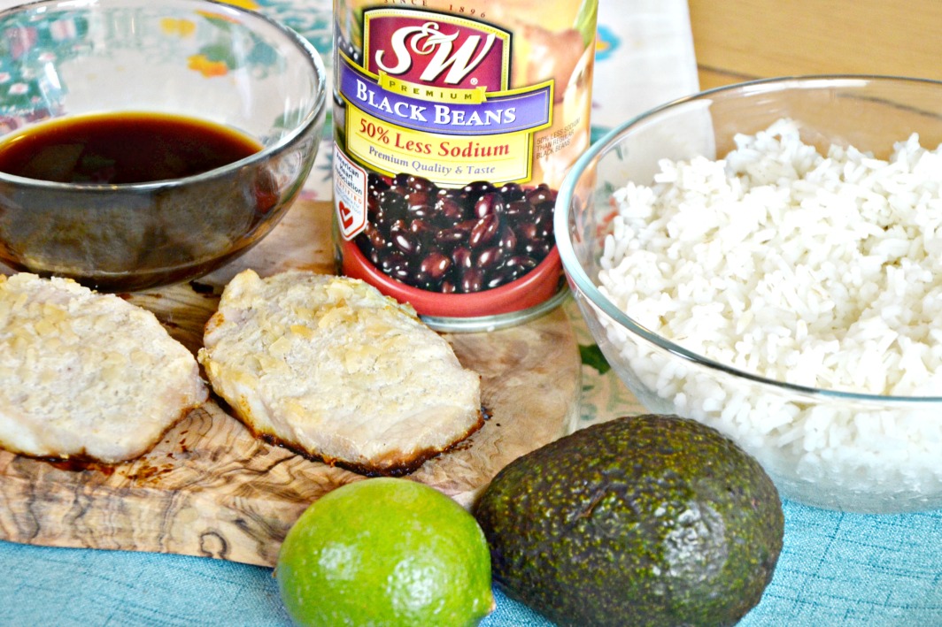 Heat beans in small pot on stovetop. Fill one third of bowl with white rice. Fill remaining bowl with black beans. Top with sliced pork chop, avocado and lime.